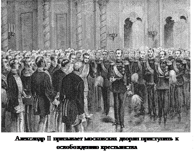 По возвращении из путешествия Александр включился в государственную деятельность. С 1839 года он присутствует на заседаниях Государственного совета, а с 1840-го - еще и на заседаниях Комитета министров. В 1841 - 1842 годах он уже был членом этих высших государственных учреждений. Наконец, в 1842 году по случаю двухмесячного отъезда Николая 1 из столицы, на Александра было возложено решение всех государственных дел. В последующие годы это стало правилом. В 1846 году Николай сделал сына председателем Секретного комитета по крестьянскому вопросу. Одновременно наследник исполнял военные должности. В 1844 году он получил полного генерала, в 1849 году сделался главным начальником военно-учебных заведений и принял командование над Гвардейским корпусом, а в 1852 году был произведен в главнокомандующие Гвардейским и Гренадерским корпусами. В 1850 году для ознакомления с военными действиями Александр поехал на Кавказ. В целом, как всегда, это была парадная поездка по гарнизонам. Только в Дагестане цесаревич стал свидетелем боевой схватки с чеченцами, он не утерпел и поскакал за цепь под огнем неприятеля. Император Николай при жизни полностью заслонял и подавлял своей личностью сына. Тот всегда оставался лишь послушным исполнителем воли своего родителя, но вот 18 февраля 1855 года Николай скоропостижно умер. Александр хорошо понимал, что сокрушительное поражение России в последней Крымской войне, падение Севастополя и последовавшая затем полная политическая изоляция России в Европе явились прямым следствием пагубной внутренней политики его отца. Первые годы своего царствования император пытался ликвидировать последствия Восточной войны и порядков николаевского времени. В отношении внешней политики Александр явился продолжателем политики Александра I и Николая I. Кроме того, на первом приеме дипломатического корпуса, государь заявил, что готов продолжать войну, если не достигнет почетного мира. Таким образом он продемонстрировал Европе, что, в этом плане, является продолжателем политики отца. Также и во внутренней политике у людей сложилось впечатление, что новый император продолжит дело своего отца. Однако на практике это оказалось не так:"повеяло мягкостью и терпимостью, характеристичными для темперамента нового монарха. Сняты были мелочные стеснения с печати; университеты вздохнули свободнее...",говорили, что "государь хочет правды, просвещения, честности и свободного голоса." В действительности, так оно и было, так как, наученный горьким опытом бессилия в Крымской войне, Александр потребовал "откровенного изложения всех недостатков".Некоторые историки полагают, что на первых порах программы вообще не было, так как трудности военного времени не давали ему сосредоточится на внутреннем благоустройстве страны. Только после окончания войны в манифесте 19 марта 1856 года Александр II сказал свою знаменитую фразу, которая стала лозунгом для России на долгие годы:"Да утверждается и совершенствуется сея внутреннее благоустройство; правда и милость да царствует в судах сея; да развивается повсюду и с новой силой стремление к просвещению и всякой полезной деятельности..." Отмена Крепостного права Крепостное право в России просуществовало гораздо дольше, чем в любой другой европейской стране и приняло такие формы, что мало чем отличалось от рабства. Од