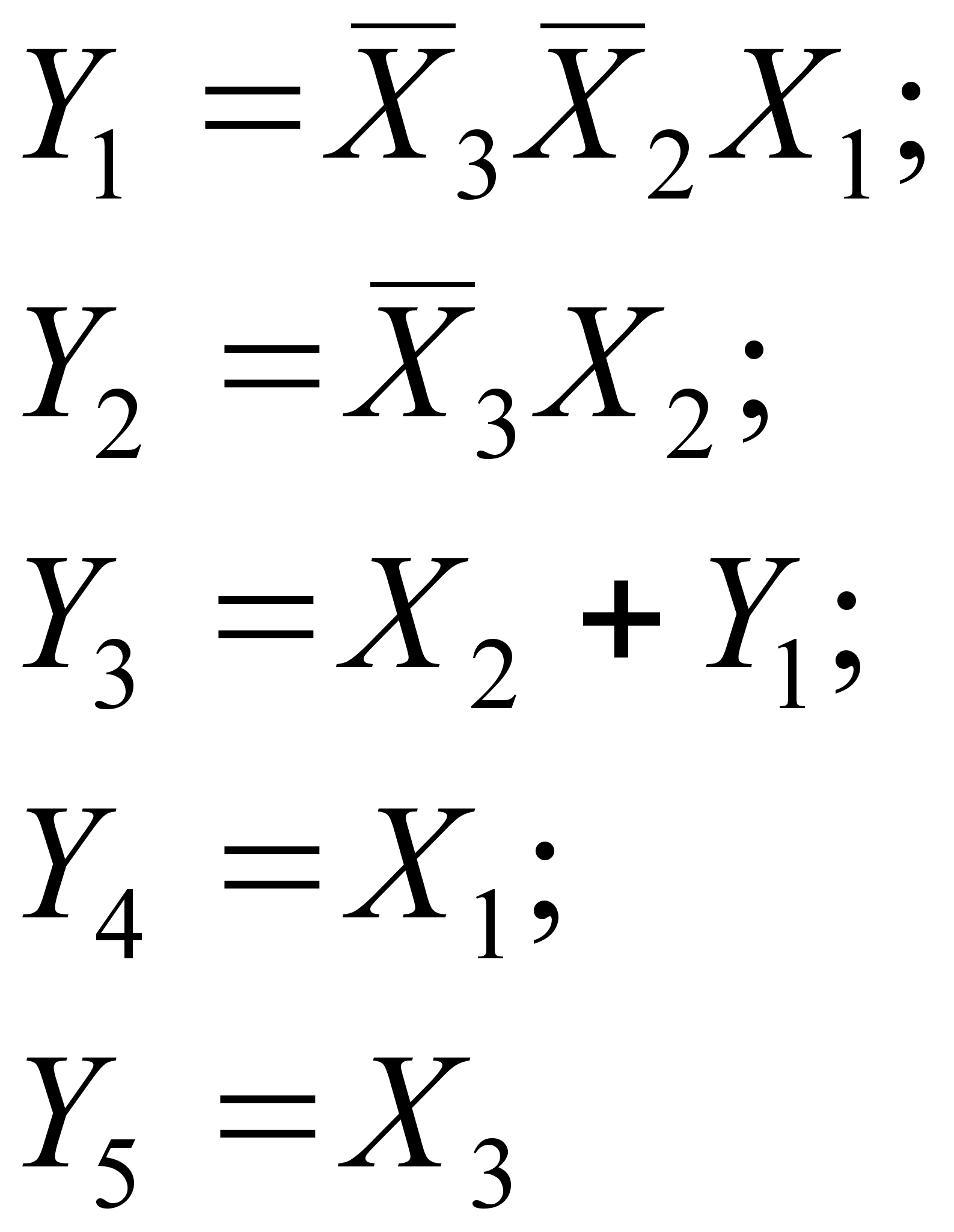 Переключательные функции же для сигналов Y1, Y2, Y3, Y4 и Y8 необходимо минимизировать при помощи карт Карно. Для этого необходимо составить карту Карно размером 88 ячеек, поскольку значения выходных сигналов зависят от 6-ти переменных, то X3X2X1 откладывают по столбцам, а X6X5X4 — по строкам.