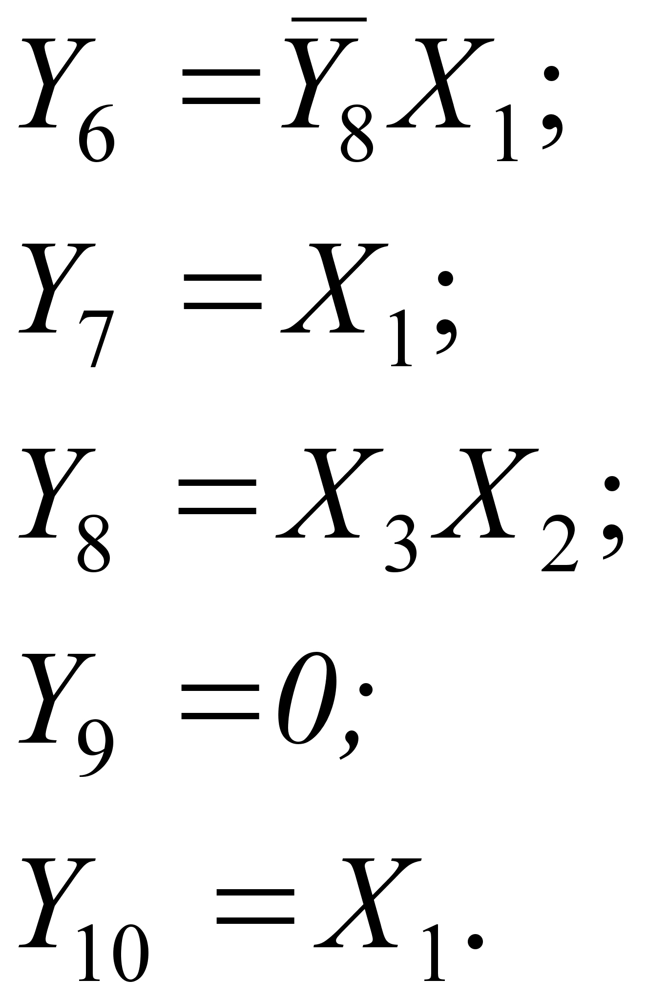 Однако, после детального рассмотрения таблицы можно прийти к выводу, что некоторые из функций являются весьма простыми и не требуют дальнейшей минимизации. Так, видно, что состояние выходного сигнала Y10 соответствует состоянию входных сигналов X1, X4 и X6. Примем Y10=X1. Далее, видно, что выходной сигнал Y9 не меняется на протяжении всех тактов и имеет значение L0, тогда Y9=0. Сигнал Y7 всегда равен сигналу Y10: Y7= Y10. Из сопоставления сигналов Y8 и Y6 видно, что Y6=Y8 и Y6=0 в случае сброса устройства, тогда: Y6=Y8X1. Также можно утверждать, что Y5=X3.