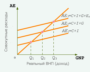 , это означает, что домохозяйства и предприниматели стремятся тратить больше, чем может реально произвести экономика. Объема ВНП хватает только для потребления, и инвестиции не могут быть осуществлены. Дальнейший анализ кейнсианской модели предполагает включение в общую сумму расходов государственных расходов и чистого экспорта.