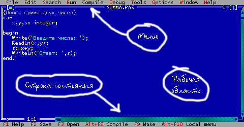 Описание языка Turbo PascalЯзык Паскаль, названный в честь французского математика и философа Блеза Паскаля (1623-1662), был создан как учебный язык программирования в 1968-1971 годах швейцарским ученым Никлаусом Виртом на кафедре информатики Стэндфордского университета (Цюрих). Стандарт этого языка был утверждён позже, он считался более совершенным и удобным для работы, чем широко распространённые в то время языки программирования Алгол, Фортран, Бейсик. В настоящее время это язык имеет более широкую сферу применения, чем предусматривалось при его создании. Свое признание Паскаль получил с появлением пакета Турбо Паскаль (Turbo Pascal). Этот язык отличается простотой понимания, стройностью и структурностью алгоритмов, быстротой компилятора и удобными средствами создания и отладки программ. Достоинствами языка Паскаль являются: 1. Простой синтаксис языка. Небольшое число базовых понятий. Программы на Паскале достаточно легко читаемы. 2. Достаточно низкие аппаратные и системные требования, как самого компилятора, так и программ, написанных на Паскале. 3. Универсальность языка. Язык Паскаль применим для решения практически всех задач программирования. 4. Поддержка структурного программирования, программирования "сверху-вниз", а также объектно-ориентированного программирования. В настоящем пособии рассматривается Turbo Pascal v7.0. Данная версия разработана фирмой Borland и является последней в линейке компиляторов Pascal для DOS. Дальнейшее развитие Паскаль получил в Delphi - системе разработки программ для Windows. Среда разработчика Turbo Pascal 7.0Базовыми компонентами система программирования Турбо Паскаль являются компилятор языка Паскаль, средства создания и редактирования исходных текстов программ и средства их отладки (поиска ошибок). Все эти компоненты объединены в единую интегрированную среду разработчика , с которой как раз и работает программист, создавая свои программы. Запуск программы Будем считать, что компьютер для работы с Турбо Паскаль настроен так, как это сказано в приложении. Для начала работы с Турбо Паскаль удобнее всего поступить следующим образом: 1. Запустить Norton Commander; 2. Зайти в каталог, в котором планируется сохранять файлы с исходными текстами программы, а также вспомогательные файлы вашей программы; 3. Вызвать горячее меню Norton Commander (нажав клавишу F2); 4. Выбрать строку "Turbo Pascal 7.0"; 5. Если окно редактирования не открылось, то открыть его через пункт меню "File" (нажать Alt+F, выбрать New). Если у вас уже есть некоторый файл с исходным текстом программы (файл с расширением pas), с которым вы хотите продолжить работу, то достаточно навести на него указатель Norton Commander и нажать Enter. В этом случае запустится Turbo Pascal и сразу откроется текст выбранной вами программы. Окно среды разработчика Основной экран интегрированной среды разработчика Turbo Pascal 7.0 выглядит следующим образом: