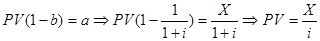 Формулу для определения сегодняшнего значения пожизненной ренты можно также использовать для определения сегодняшнего значения аннуитета , определённой суммы, выплачиваемой каждый определённый период в течении определённого периода времени. В этом случае, как вы уже должны были догадаться, мы имеем дело с геометрической прогрессией с конечным числом членов. Представив сегодняшнее значение аннуитета как разницу между сегодняшним значением пожизненной ренты, начинающейся сегодня и пожизненной ренты начинающейся через определённое время t , в течении которого будет выплачиваться наш аннуитет мы получаем следующую формулу для определения сегодняшнего значения аннуитета: