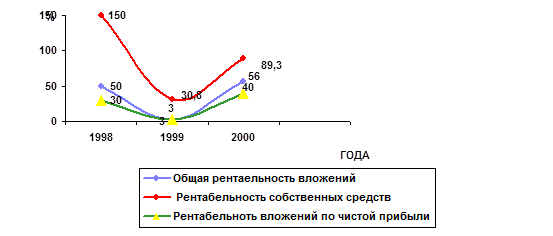Рисунок 5. Изменение показателей рентабельности продукции за 1998- 2000 г. На основе расчётов можно сделать следующие выводы. Показатель общей рентабельности за отчетный период вырос с 0,7 в 1999 до 7,4 в 2000 году, то есть увеличился в 10,6 раз. Это говорит о том, что в 2000 году каждый рубль реализации приносил в среднем около 75 копеек балансовой прибыли. Надо отметить резкое снижение данного показателя по сравнению с 1998 годом, когда он составлял 8,8% и упал за 1999 год до 0,7 (т.е. в 12,6 раз). Показатель рентабельности продаж по чистой прибыли также вырос в 2000 году с 0,7 на начало года до 5,2 на конец отчетного периода. Это говорит о том, что спрос на продукцию несколько возрос. Таким образом в 2000 году на 1 руб. реализованной продукции предприятие имело 5,2 копеек чистой прибыли. Рентабельность всей реализованной продукции увеличилась за отчетный период на 9,2% и составила к концу 2000 года 11,2%. Это значит, что в конце отчетного периода каждый рубль реализации стал приносить на 9,2 копеек больше прибыли от реализации. Как видно из выше сказанного, все показатели рентабельности продукции средние, некоторые низкие. В 1999 году вследствие снижения спроса на продукцию из-за неплатежеспособности большинства потребителей, а также вследствие получения убытков от внереализационных операций показатели рентабельности продукции существенно снизились. 2 .Рентабельность вложений предприятия. Рентабельность вложений предприятия - это следующий показатель рентабельности, который показывает эффективность использования всего имущества предприятия. Среди показателей рентабельности предприятия выделяют 5 основных: 1. Общая рентабельность вложений, показывающая какая часть балансовой прибыли приходится на 1руб. имущества предприятия, то есть насколько эффективно оно используется. 2.Рентабельность вложений по чистой прибыли; 3.Рентабельность собственных средств, позволяющий установить зависимость между величиной инвестируемых собственных ресурсов и размером прибыли, полученной от их использования. 4.Рентабельность долгосрочных финансовых вложений, показывающая эффективность вложений предприятия в деятельность других организаций. 5. Рентабельность перманентного капитала. Показывает эффективно сть использования капитала, вложенного в деятельность данного предприятия на длительный срок. Необходимая информация для расчёта представлена в таблице 16. Таблица 16. Показатели для расчёта рентабельности. тыс. руб.