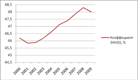 Рис. 1.3 Занятое и безработное население Украины в трудоспособном возрасте в период с 2000г. по 2009г. Вывод: проанализировав вышеприведенные графики, можно сделать следующие выводы: -занятого населения в Украине, в период 2000-2009гг, было больше чем безработного, учитывая различные возрастные категории ( в возрасте 15-70 лет и в трудоспособном возрасте) -доминирование занятого населения над безработным, к сожалению, еще не свидетельствует о высоком социальном развитии Украины, так как для этого показатель доминирования должен быть на определенном, утвержденном уровне. Если правильно сбалансировать экономические, социальные и политические силы вышеупомянутый уровень можно будет достигнуть в течении нескольких лет. Коэфициент ЭАН на tтую дату равен численности ЭАН на эту дату, разделенной на всю численность населения на эту же дату: К Таблица 1.3 Расчет коэффициента ЭАН Украины на tтую дату