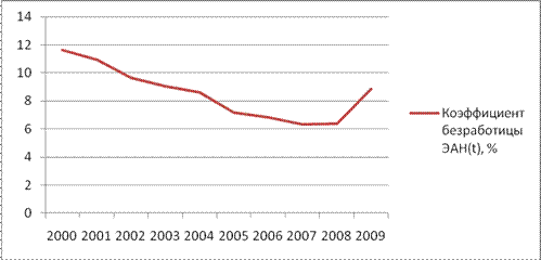 Рис. 1.5 Коэффициент занятости ЭАН Украины на tтую дату в период 2000-2009гг Вывод: проанализировав приведенные данные можно констатировать, что в период с 2000г. по 2008г. , согласно тренду вышеуказанного графика, наблюдалось стабильное возрастание занятости населения, но начиная с 2008г. можно отметить резкий спад последней. Безработные, по определению МОТ, - это лица старше минимального рабочего возраста, которые в течении учетного периода были: -без работы; -готовые немедленно работать; -предпринимали конкретные шаги, чтобы найти работу В состав безработных также включаются лица, которые обучаются по направлению служб занятости, а также учитываются учащиеся и студенты, инвалиды и пенсионеры. В случае, если они активно занимаются поисками работы и готовы к ней приступить. Коэффициент безработицы рассчитывается как отношение числа безработных к числу ЭАН: К Таблица 1.5 Расчет коэффициента безработицы ЭАН Украины на tтую дату в период с 2000г. по 2009г.