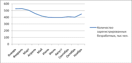 Продолжительность безработицы определяется длительностью периода в течении которого человек будучи безработным ищет работу. Различают продолжительность завершенной безработицы, которая учитывает время с начала поиска работы и до момента трудоустройства, и продолжительность незавершенной безработицы – время с начала поиска работы и до момента опроса о безработице. Рассчитывают также среднюю численность безработных: = где, в – количество месяцев Таблица 1.7 Количество безработного населения Украины в 2010г. (данные по месяцам)