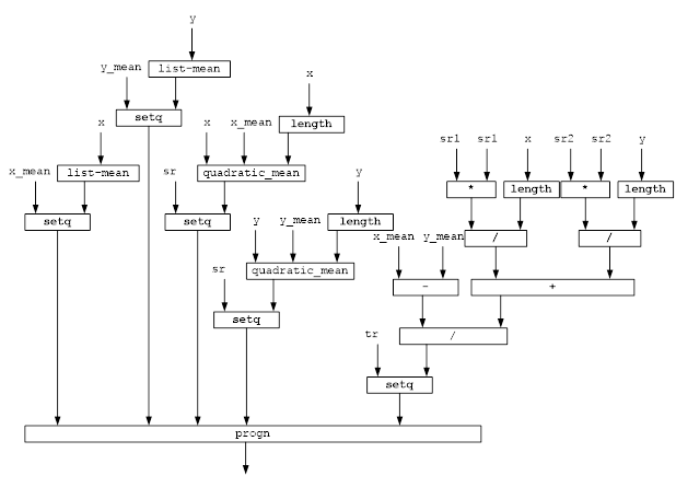 Рисунок 8 – Функциональная модель решения задачи для функции student_test2 4 Программная реализация решения задачи ;проверка гипотезы при наличии одной выборки ;(x-_x_)^2 (defun sum_x-x_mean (lst mean) (cond ((null lst) 0) ((atom lst) (* (- lst mean) (- lst mean))) (t (+ (sum_x-x_mean (car lst) mean) (sum_x-x_mean (cdr lst) mean))) ) ) ;среднеквадратическое отклонение (defun quadratic_mean (lst mean n) (sqrt (/ (sum_x-x_mean lst mean) (- n 1))) ) ;среднее арифметическое (defun list-mean (lst) (float (/ (apply '+ lst) (length lst))) ) ;h0 - нулевая гипотеза (defun student-test1 (x h0) (setq x_mean (list-mean x)) (setq sr (quadratic_mean x x_mean (length x))) (setq tr (/ (- x_mean h0) (/ sr (sqrt (length x))))) tr ) ;проверка гипотез по двум выборкам (defun student-test2 (x y) (setq x_mean (list-mean x)) (setq y_mean (list-mean y)) (setq sr1 (quadratic_mean x x_mean (length x))) (setq sr2 (quadratic_mean y y_mean (length y))) (setq tr (/ (- x_mean y_mean) (sqrt (+ (/ (* sr1 sr1) (length x)) (/ (* sr2 sr2) (length y)))))) tr ) ;число степеней свободы для двух выборок (defun df2 (x y) (setq x_mean (list-mean x)) (setq y_mean (list-mean y)) (setq sr1 (quadratic_mean x x_mean (length x))) (setq sr2 (quadratic_mean y y_mean (length y))) (setq в (/ (expt (+ (/ (* sr1 sr1) (length x)) (/ (* sr2 sr2) (length y))) 2) (+ (/ (expt (/ (* sr1 sr1) (length x)) 2) (- (length x) 1)) (/ (expt (/ (* sr2 sr2) (length y)) 2) (- (length y) 1)) ) )) d ) ;число степеней свободы для одной выборки (defun df1 (x) (length x) ) (defun test-hypothesis () (setq input-stream (open " d:\\data.txt" :direction :input)) ;количество выборок (setq cnt (read input-stream)) (when (= cnt 1) (setq x (read input-stream))) (when (= cnt 2) (setq x (read input-stream)) (setq y (read input-stream)) ) ;тип гипотезы (setq type (read input-stream)) ;нулевая гипотеза (setq h0 (read input-stream)) ;альтернативная гипотеза (setq h1 (read input-stream)) ;табличное значение (setq t-tabl (read input-stream)) (close input-stream) (when (= cnt 1) (setq tr (student-test1 x (car h0))) (setq h0 (cadr h0)) ) (when (= cnt 2) (setq tr (student-test2 x y))) ;t_tabl < tr < t_tabl => h0 иначе h1 ; tr < t_tabl => h0 иначе h1 ; tr >-t_tabl => h0 иначе h1 (setq hpts (cond ((eql type '/=) (if (and (> tr (* -1 t-tabl)) (< tr t-tabl)) h0 h1)) ((eql type '>)(if (< tr t-tabl) h0 h1)) ((eql type '<)(if (> tr (* -1 t-tabl)) h0 h1)) ) ) (setq output-stream (open " d:\\hypothesis.txt" :direction :output)) (format output-stream "~~Kriterii Stiudenta ~A~%" tr) (format output-stream "~~Tablichnoe Znachenie ~A~%" t-tabl) (format output-stream "~~Prinyataya gipoteza : ~A~%" hpts) (close output-stream) ) (test-hypothesis ) 5 Пример выполнения программы Пример 1.
