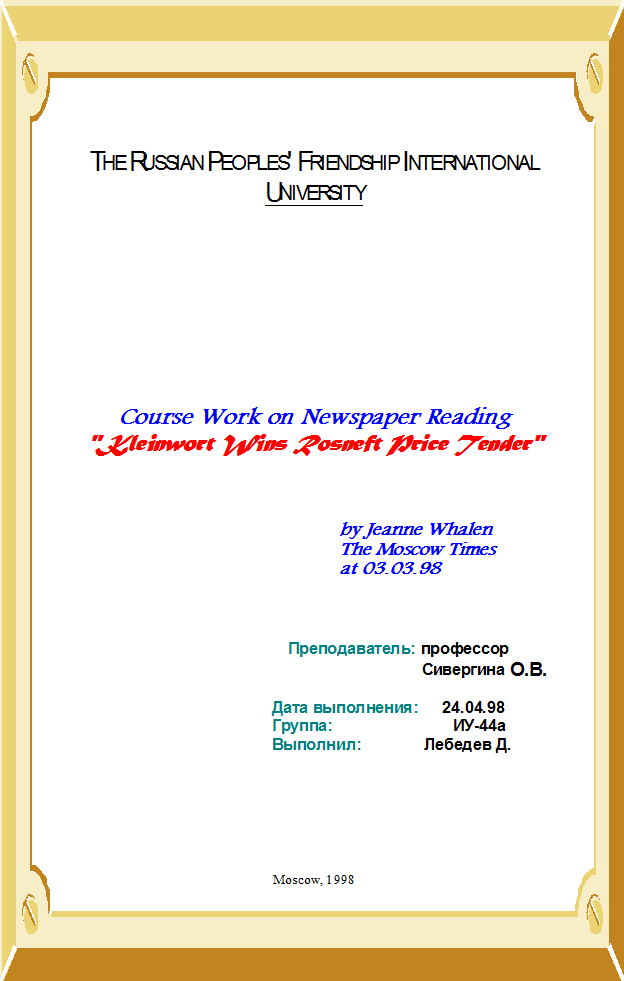 catchword 1. The article proper 2. The translation of the article 3. Summary 4. Vocabulary The Translation Of The Article Kleinwort Benson выиграл право оценки стоимости Роснефти в тендере. Германский инвестиционный банк "Dresden Kleinwort Benson"выиграл право оценить стоимость нефтяной компании "Роснефть", до того как она будет распродана на приватизационном аукционе в этом году. Банк победил трех российских и трех иностранных покупателей в тендере, состоявшемся в субботу. Сергей Перевизенцев, представитель Министерства Приватизации сказал, что Kleinwort Benson оценил стоимость Роснефти в шестьсот пятьдесят тысяч американских долларов, предлагая более низкую цену, чем его ближайший соперник "NatWest Securities" на один миллион американских долларов. "Когда аудитор даст свою оценку стоимости, комиссия тендера должна назначить стартовую цену",- сказал Перевизенцев. Ожидают, что комиссия, состоящая из семи человек, объявит об условиях и сроках приватизации двадцать пятого марта. Kleinwort Bensonуже был действующим советником Газпрома, который в альянсе с "Royal Dutch/Shell" и "LUKoil", сделает ставку на Роснефть. В прошлом году банк помог нефтяному гиганту получить синдикатный кредит в размере трех миллиардов американских долларов, а также другого кредита в размере 1,2 миллиарда американских долларов. Один московский аналитик по вопросам нефти заявил, что положение Kleinwort Bensonможет вызвать конфликт в заинтересованных кругах, но он также добавил, что уверен в том, что банк соответствующим образом воспримет сложившуюся ситуацию. "Kleinwort- это не просто непредвзятая и беспристрастная фирма, но также и международная фирма с известной во всем мире репутацией и я не думаю, что они сделают что-нибудь, порочащее их репутацию",- сказал Алексей Кокин, один из аналитиков MFK-Renaissance. "У этой компании очень хорошая репутация и это не в ее интересах разрушать свою репутацию, предоставляя некоторую информацию Газпрому",- согласился Александр Агибалов, один из нефтяных аналитиков при Russian brokerage Aton. Одна из представительниц Kleinwort Benson в Лондоне заявила, что у нее нет комментариев по поводу победы в тендере. "Robert Fleming Securities","Deutsche Morgan Grenfell" и российские компании: "РосЭко", "Анализ" и инвестиционная фирма "Фондовый Магазин" также принимали участие в тендере. В попытке сделать продажу открытой и справедливой российское федеральное правительство предпочло нанять независимого аудитора, чтобы он оценил стоимость компании "Роснефть" и рекомендовал стартовые цены. Министерство Приватизации подчеркнуло, что никакой контролер, хотя бы отдаленно имеющий связи с потенциальным покупателем Роснефти, не будет иметь разрешения проводить оценку стоимости компании. Как только такой аудитор определит стоимость Роснефти, комиссия тендера установит стартовые цены. Агибалов сказал, что комиссия смогла бы установить стартовые цены выше, если правительство решит продать семьдесят пять процентов и одну акцию Роснефти в инвестиционном тендере, условие которого более подходит для потенциальных участников тендера. Кроме триумвирата "Газпром-Shell-LUKoil", другим участником аукциона по продаже Роснефти является альянс между British Petroleum и компании "Сиданко", принадлежащей банку "ОНЕКСИМ". Третий участник - это нефтяная компания "ЮКСИ", которая вскоре будет образована при слиянии компаний "ЮКОС" и "Сибнефть". В январе Газпром и группа ОНЕКСИМ заявили, что они будут менее заинтересованы в по
