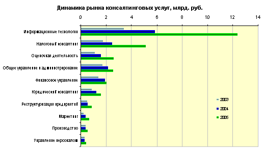 В качестве наиболее динамично растущих секторов консалтингового рынка в 2005 г. «Коммерсант деньги» указывает на консалтинг в сфере производства, оценочную деятельность и налоговый консалтинг. Эти изменения, как и рост ИТ-консалтинга, исследователи связывают с реорганизацией крупных корпораций в различных отраслях. Источником дополнительного спроса на налоговый консалтинг послужила также реформа налогового законодательства.