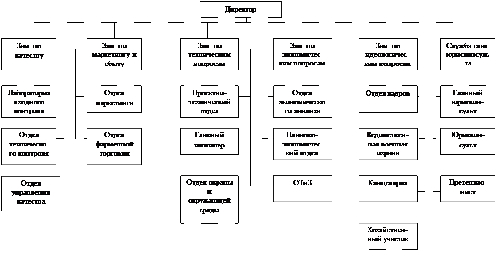К завершению смены задел должен составить 5 шт. Координация способом заделов осуществляется по следующим правилам: 1. Запуск предметов труда в последующую операцию начинается с учетом наперед заданного срока l и последующие запуски проводятся с учетом tп - такта; 2. По каждому сроку запуска находится разность между выпущенными и запущенными предметами труда, которая составляет задел соотв. сроку l: НП = l / tп * bп (1.8) 3. Исчерпание задала осуществляется очереднымизапусками предметов труда. Пополнение задела осуществляется очередными выпусками предметов труда из отправной операции. Применение этого способа может быть обусловлено различными причинами: территориальной обособленностью процессов, значительной удаленностью друг от друга, несопряженностью производственных мощностей и др. Этот способ координации применяется между цехами №1,№4 и №3,№4: НПБ= Рсм= 400+400=800 (шт.). ИТОГО незавершенное производство: НП = 800+400+856+5+400+400=2861 (шт.). 2 РАСЧЕТ ПРОИЗВОДСТВЕННОЙ ПРОГРАММЫ ЦЕХА (ПРЕДПРИЯТИЯ) Производственная программа – это развернутая программа выпуска продукции в плановом периоде по объему, ассортименту, качеству и срокам изготовления и сбыта продукции. Производственная программа рассчитывается следующим образом: 1. Определяется сменное задание (Рсм ) ; 2. Рассчитывается производственная программа (ПП) с учетом сменного задания: ППгод = Рсм * Фп * n, (2.1) где Фп – полезный фонд времени в планируемом году, в днях, n – число смен. Для данной курсовой годовая производственная программа: ППгод = 800*239*1 = 191200 (шт.). 3. ПП распределяется по кварталам пропорционально числу рабочих дней и сменному заданию: ППкв i = Рсм * Дркв i * n, (2.2) где Дркв i – число рабочих дней соответствующего квартала. В данном случае расчеты выглядят следующим образом: ППкв1 = 800*61 = 48800 (шт.); ППкв2 = 800*64 = 51200 (шт.); ППкв3 = 800*48 = 38400 (шт.); ППкв4 = 800*66 = 52800 (шт.). 3 РАСЧЕТЫ ТЕХНИКО-ЭКОНОМИЧЕСКИХ ПОКАЗАТЕЛЕЙ ЦЕХА (ПРЕДПРИЯТИЯ) 1. Годовой выпуск продукции: Вгод = Рсм * Др * n, (3.1) где n – число смен, Др – число рабочих дней. Вгод = 800*239 = 191200 (шт.). 2. Производительность труда (выработка) одного рабочего в смену, год: ПТв смену = Рсм / Кф , (3.2) ПТв смену 1 = 400/17 = 23,5(шт./см.); ПТв смену 2 = 800/16 = 50 (шт./см.); ПТв смену 3 = 400/21 = 19,1 (шт./см.); ПТв смену 4 = 800/43 = 18,6 (шт./см.). ПТв год = Вгод / Кф . (3.3) ПТв год = 191200/135 = 1416,3 (шт./год). 3. Коэффициент использования производственной мощности: Кпм = Рсм / ПМсм , (3.4) где Рсм – сменное задание (шт.), ПМсм – производственная мощность (шт.). Кпм 1 = 400/600 = 0,666; Кпм 2 = 800/1200 = 0,666; Кпм 3 = 400/500 =0,8; Кпм 4 = 800/1000 = 0,8. 4.. Длительность производственного цикла по активному и календарному времени Тц(а) и Тц(к). Так как НП = Тц(а)* b/t, то выразив из формулы Тц(а), получим: Тц(а) = НП * t / b, (3.5) Тц(а) =2861*5,87/10 = 1679,4 (мин.). Тц(к) = Тц(а) *24*Дк Тсм * Др *n (3.6) Тц(к) = 1679,4*24*365 =7694,3 (мин.). 8*239 4. Удельное незавершенное производство: НПуд = НП Рсм (3.7) НПуд = 2861/800 = 3,58 (шт./см.). 4 РАЗРАБОТКА СТРУКТУРЫ ПРЕДПРИЯТИЯ 4.1 Построение производственно-технологической структуры предприятия Производственная структура предприятия - это состав его производственных подразделений и обслуживающих хозяйств, принципы их построения, взаимосвязи и размещения. Каждое предприятие состоит из производств, цехов, участков, хозяйств, органов управления и организация по обслуживанию работников предприятия. Чёткая классификация и установление взаимосвязей между ними позволяют обоснованно организо
