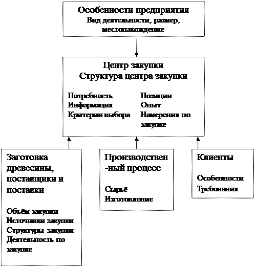 Рис. 1. Рамочная схема анализа рынков Представленная в таком виде картина еще недостаточно четко указывает те сферы, по которым требуется информация. Понятия рамки необходимо перевести в оперативные измеримые формы. Такой перевод показывает, что означают на практике понятия на уровне рамок. Перевод рамок анализа рынков в оперативную форму: 1. Макроокружение: · спрос (совокупный спрос на древесное сырье и его динамика в изучаемых странах; спрос на древесное сырье по сортиментам; спрос на древесное сырье по сферам использования); · предложение (предложение отечественного древесного сырья в изучаемых странах; ассортиментный состав ввоза; объемы ввоза по странам; · прочее макроокружение (общее экономическое развитие рынков в изучаемых странах). 2. Микроокружение: · конкуренты (основные конкуренты в изучаемых странах; конкурирующая продукция); · системы распределения (структура и деятельность каналов сбыта в изучаемых странах; структура и деятельность транспортных систем); · клиентура (потенциальные клиенты; количество клиентов по всем группам; сфера деятельности клиентов; месторасположение клиентов). В ходе проведения анализа рынков клиентов получают лишь перечисленные сведения. В ходе эмпирического исследования на основе интервьюирования потенциальных клиентов получают значительный объем дополнительной подробной информации. Сектор клиентуры в микроокружении, таким образом, расширяет границы рамок, регулирующих исследования клиентуры. 2 .3.3. Рамки изучения клиентуры Рамки исследования клиентуры регулируют потребность в получении первичного материала (опросы). Главное внимание при проведении исследования сосредоточено на центрах закупки. Центрами закупки называют группы тех лиц, которые, так или иначе, участвуют в принятии решений предприятий по закупкам. Требования производственного процесса являются определяющими критериями решений по закупке сырья. Предполагается, что требования клиентов к используемому сырью будут чаще всего определяться через требования к конечному продукту. В данном развивающем проекте не анализируется процесс выработки решений по покупкам. Ведь целью ставится выяснение условий приобретения финского древесного сырья и связанных с этим факторов. Рамки предполагают, что коммерческая деятельность предприятия должна строиться на приоритетности клиента, из чего следует, что предъявляемые клиентами требования к конечной продукции опосредованно регулируют деятельность предприятия и через нее закупки древесного сырья. Перевод рамок анализа клиентуры в оперативную плоскость. Понятия, которыми оперируют в рамках модели, в данном исследовании включают в себя следующее: 1. Особенности предприятия (сфера деятельности; торговый оборот; численность работающих; расположение). 2. Центр закупки (численность и положение лиц, ответственных за принятие решений о закупке; критерии выбора импорта древесного сырья; критерии выбора поставщиков; позиции в отношении финского импортного древесного сырья; опыт (удовлетворенность) в приобретении импортного сырья и в отношениях с поставщиками; намерения покупать ввозимое финское древесное сырье). 3. Закупка древесного сырья, поставщики и поставки (закупки по странам и поставщикам; каким образом на предприятии организована закупка импортного сырья; како