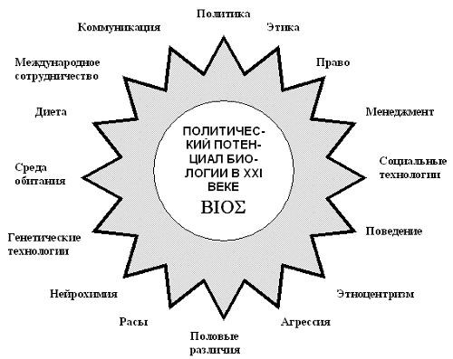 Поэтому каждое из направлений современной биополитики будет рассматривается в сочетании с соответствующими материалами биологических наук, связанными с исследованиями социального поведения и биосоциальных систем у различных форм живого. Например, в разделе об эволюционно-биологических предпосылках человеческой социальной организации и политической системы (раздел 3) имеется обширная часть, в которой на фоне панорамы истории жизни на Земле и сжатого очерка об эволюции человека как вида рассматривается вопрос о возникновении (прото)политических структур как закономерного итога прогрессивного исторического развития биосоциальных систем вообще. Биосоциальным системам уделено много внимания и в разделе об этологических и социобиологических подходах в приложении к политически важным граням поведения человека. Соответствующие формы человеческого поведения как бы будут погружены в эволюционную канву, связаны со "сквозными", "архетипическими" (выражение Ю. Плюснина) категориями биосоциальных систем, применимыми в принципе к разнообразным биологическим видам. Поскольку автор данной книги испытывает профессиональный интерес к миру микроорганизмов и поскольку они в примитивном, "обнаженном" виде демонстрируют перед нами многие стороны биосоциальных взаимодействий, то мы будем с разумной осторожностью и уместностью "низводить" ряд характеристик биосоциальных систем до уровня микроорганизмов. Как ни далеки от нас эти одноклеточные существа, они тем не менее формируют биосоциальные системы из многих индивдов (колонии). Итак, многовековая история познания живого, прошедшая стадии мифологии, натурфилософии, механицизма и ныне достигшая стадии гуманитаризации, послужила предпосылкой современной биополитики (как и целого спектра других стыковых биолого-социальных наук). Для биополитики особенно важны такие области биологии, как этология, социобиология, экология, генетика, нейрофизиология, теория эволюции. Биополитика может быть классифицирована на следующие направления: Понятие "политический потенциал биологии", предмет настоящей книги, соответствует максимально широкому, авторскому, толкованию биополитики, и разные биополитические школы посвящают себя различным граням этого потенциала ЛИТЕРАТУРА