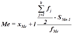 fМе – частота медианного интервала, SMе-1 – кумулятивная (накопленная) частота интервала, предшествующего медианному. Для расчета медианы необходимо, прежде всего, определить медианный интервал, для чего используются накопленные частоты (или частости). Так как медиана делит численность ряда пополам, она будет располагаться в том интервале, где накопленная частота впервые равна