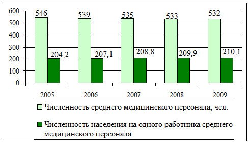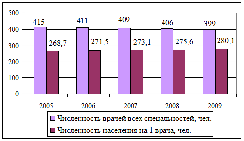 Распределение ответственности сотрудников Управления: 0 - нет; 1 - первый исполнитель; 2 - соисполнитель; 3 - проверка исполнения; 4 - согласование; 5 - участие (помощь, совет, обсуждение). 2.1.3 Реорганизация и ликвидация Управления Реорганизация и ликвидация Управления может быть осуществлена Думой Артемовского городского округа в соответствии с действующим законодательством. При ликвидации Управления документы постоянного хранения передаются на хранение в архивный отдел администрации Артемовского городского округа [11]. Передача и упорядочение документов осуществляются Управлением в соответствии с требованиями архива [12]. 2.2 Анализ кадрового обеспечения Сеть муниципального здравоохранения Артемовского городского округа в 2009 году представлена 6 муниципальными больничными учреждениями, в которых работают 399 врачей и 532 средних медицинских работника. За период с 2005 года количество работающих врачей уменьшилось с 415 до 399 (Рисунок 2.12), среднего медицинского персонала уменьшилось с 546 до 532 человек (Рисунок 2.13). При анализе кадрового потенциала обеспеченность врачебными кадрами города Артема на 10 тысяч населения ниже показателей по Приморскому краю и составляет 35,7 в 2009 году (краевой - 44,7). Обеспеченность средним медицинским персоналом также ниже краевых показателей и имеет в 2009 году 47,6 (краевой - 64,9) [13].