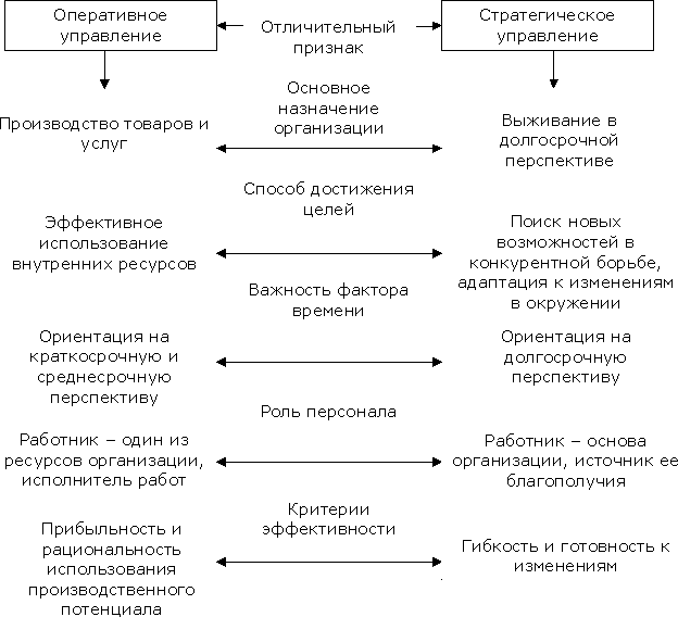 Рис.1 Стратегия управления Сущность стратегического управления заключается в ответе на 3 важных вопроса: 1. В каком положении предприятие находится в настоящее время? 2. В каком положении оно хотело бы находиться через 3, 5, 10 месяцев? 3. Каким способом достичь желаемого результата? Для решения первого вопроса необходима информационная основа с соответствующими данными для анализа прошлых, настоящих и будущих ситуаций. Второй вопрос отражает такую важную особенность для стратегического управления, как его ориентация на будущее. Необходимо определить к чему стремиться, какие ставить цели. Третий вопрос связан с реализацией выбранной стратегии, в ходе которой может происходить корректировка двух предыдущих этапов. Важнейшими составляющими данного этапа являются имеющиеся или доступные ресурсы, система управления, организационная структура и персонал, который будет реализовывать данную стратегию. Таким образом, сущность стратегического управления состоит в формировании и реализации стратегии развития организации на основе непрерывного контроля и оценки происходящих изменений в ее деятельности с целью поддержания способности к выживанию и эффективному функционированию в условиях нестабильной внешней среды.[1] 1.2. Функции стратегического управления Стратегическое управление на предприятии выражается в следующих пяти функциях: 1. Планирование стратегии. 2. Организация выполнения стратегических планов. 3. Координация действий по реализации стратегических задач. 4. Мотивация на достижение стратегических результатов. 5. Контроль за процессом выполнения стратегии. Планирование стратегии предполагает выполнение таких подфункций, как прогнозирование, разработка стратегии и бюджетирование. С учетом результатов проведенного анализа руководство предприятия формулирует миссию (сферу бизнеса, глобальную цель), определяет перспективы развития организации и разрабатывает стратегию. Увязка стратегических целей предприятия с результатами деятельности отдельных подразделений осуществляется посредством разработки необходимой программы действий и составления бюджета. Бюджетирование включает стоимостную оценку программы и распределение ресурсов. Организация выполнения стратегических планов предполагает формирование будущего потенциала предприятия, согласование структуры и системы управления с выбранной стратегией развития, создание корпоративной культуры, поддерживающей стратегию. Координация действий менеджеров по формированию и реализации генеральной стратегии заключается в согласовании стратегических решений различных уровней и последовательной консолидации целей и стратегий структурных подразделений на более высоких ступенях управления.[6] Мотивация как функция стратегического управления связана с разработкой системы стимулов, побуждающих к достижению поставленных стратегических результатов. Контроль состоит в непрерывном наблюдении за процессом реализации стратегических планов. Он призван заблаговременно определять надвигающиеся опасности, выявлять ошибки и отклонения от принятых стратегий и политики предприятия. Реализация функций стратегического управления осуществляется посредством разработки и принятия стратегических решений. Стратегическими решениями называют управленческие 