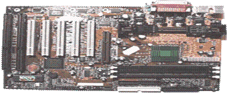Рисунок 2. Современная материнская плата Материнская (системная) плата – основной аппаратный компонент, где находятся разъемы для установки микропроцессора, оперативной памяти, кварцевый резонатор, базовая система ввода-вывода BIOS, вспомогательные микросхемы, интерфейс ввода-вывода (последовательный порт, параллельный порт, интерфейс клавиатуры, дисковый интерфейс и т.д.) и шина. Часть технического обеспечения, конструктивно отделенных от основного блока компьютера называют периферийными (устройства ввода-вывода) Для подключения устройств ввода-вывода на системном блоке имеются разъемы различных портов: СОМ - Последовательные порты. Передают последовательно электрические импульсы, несущие информации. К ним обычно подключают мышь и модем. LPT - Параллельный порт. Передает одновременно 8 электрических импульсов. Реализует более высокую скорость информации, используют для подключения принтера. USB - Последовательная универсальная шина (Universal Serial Bus) – обеспечивает высокоскоростное подключение нескольких периферийных устройств (сканер, цифровая камера и т.д) Монитор - это устройство, через которое мы воспринимаем всю визуальную информацию от компьютера. Данные, отображаемые на экране монитора, хранятся в определенном блоке памяти компьютера (видеопамять). Управляет работой монитора устройство, размещенное в системном блоке и называемое видеокартой или видеоадаптером. Видеокарта вместе с монитором и образуют видеосистему. Процессор помещает в видеопамять данные, а видеокарта монитора примерно 60 раз в секунду просматривает данные и рисует соответствующее их содержанию изображение на экране. Современные мониторы бывают постороенными на основе электронно-лучевой трубки (CRT) или жидко-кристаллическими (LCD). В CRT-мониторах изображение получается в результате свечения специального вещества - люминофора под воздействием потока электронов. LCD-мониторы сделаны из вещества, находящегося в жидком состоянии, но имеющего при этом некоторые свойства кристаллов. Молекулы жидких кристаллов меняют свойство проходящего сквозь них светового луча, таким образом на мониторе создается изображение. В настоящее время по показателю цена-качество CRT-мониторы превосходят LCD, т.е. при равном качестве LCD-мониторы дороже. Но зато в LCD-мониторах совершенно отсутствует вредное электро-магнитное излучение, а также уровень потребления энергии примерно на 70% ниже, чем у CRT. 2.3 Клавиатура Клавиатура компьютера работает под управлением программ, которые определяют, какую информацию получает компьютер в результате нажатия клавиш. Механизм обработки сигналов, поступающих от клавиатуры, примерно следующий. Каждая клавиша на клавиатуре имеет свой номер, называемый кодом. После нажатия клавиши клавиатура посылает процессору сигнал прерывания и заставляет процессор приостановить свою работу и переключиться на программу обработки прерывания клавиатуры. При этом клавиатура в своей собственной специальной памяти запоминает, какая клавиша была нажата (обычно в памяти клавиатуры может храниться до 20 кодов нажатых клавиш, если процессор не успевает ответить на прерывание). После передачи кода нажатой клавиши процессору эта информация из памяти клавиатуры исчезает. Кроме нажатия клавиатура отмечает также и отпускание каждой клавиши, посылая процессору