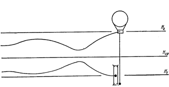 В гондоле аэростата-носителя с объемом оболочки v0 размещается лебёдка, на барабан которой намотан трос длиной Lтр. На конце троса прикреплена другая гондола с оболочкой V1.Обозначим вес аэростата-носителя Go, вес выносного малого аэростата (выносного баллонета) g1. В первый момент вся система находится на некоторой равновесной средней высоте Нср. или высоте исходного дрейфа (рис.). Затем оболочку V1 начинаем опускать на тросе, что нетрудно выполнить, поскольку подъемная сила F1 в этот момент меньше веса G1 выносной конструкции с баллонетом.