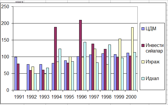Статистика Комитясинин дягигляшдирилмямиш щесабатларынын вя бир сыра дювлят комитяляринин материалларынын тящлили эюстярир ки, нефтин гиймятинин 2000-2001-жи иллярдя артымы азалманын гаршысыны алмыш вя 2000-жи илдя йцксяк артым темпи мцшащидя олунмушдур. Бунунла беля, инвестисийаларын сямярялилийини йцксялтмяк цчцн эюзлямя вахты тцкянмиш вя артыг харижи инвестисийалары дювлят зяманяти шярти иля игтисадиййатын реал бюлмяляриня жялб етмяйин вахты чатмышдыр. Беляликля, юлкя игтисадиййатымызын дцнйа базарларындан асылылыьы нефт амили иля ялагядардыр вя бу асылылыьы зяифлятмяк цчцн гейри-нефт секторларына инвестисийа гойулушларыны стимуллашдырмаг вя харижи капиталы бура жялб етмяк цчцн мягсядли дювлят програмы ишлямяк лазымдыр. Инвестисийаларын игтисади инкишафа тясиринин тящлилини мултипликасийа ямсалы васитяси иля апараг. Гейд едяк ки, мултипликсийа ямсалы васитяси иля макроигтисади эюстярижилярин динамикасынын дяйишмясинин тящлили тядгигатында апарылмышдыр. Бунунла беля, биз юз щесабламаларымызда бязи хцсусиййятляри нязяря алыб (эюстярижилярин «тямизлянмяси») мултипликатор еффектини тядгиг етмишик. Макроигтисади эюстярижилярин 1993-2000-жи илляр цчцн динамикасындан истифадя едиб хяржляр вя инвестисийа мултипликаторларыны мцяййян едяк. Бунун цчцн йухарыда верилмиш мцнасибятляриндян истифадя едиб гиймятляндирмяляри жядв.2.6-да олдуьу кими груплашдыраг. Жядвял 2.6 Истещлак мултипликаторунун ЦДМ-а тясири