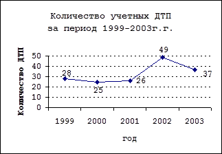 На основании общих характеристик дороги можно предположить, что участками потенциального риска ДТП могут служить узкие участки на трассе дороги, а именно: · мосты и подходы к ним; · участки с размещением остановок общественного транспорта, не оборудованных заездными карманами. 1.2 Обобщение и анализ данных о дорожно-транспортных происшествиях и дорожном движении на а/д “Подъезд к г.Северодвинску”В данном отчете приводятся результаты анализа данных об аварийности на пилотном участке дорог общего пользования Архангельской области – а/д «Подъезд к г. Северодвинску», предоставленные Областным управлением «Архангельскавтодор» и УГИБДД УВД Архангельской области. При проведении анализа использован метод сравнения и проверки по эталонным показателям или метод бэнчмаркинга ( benchmarking ) , который широко применяется в практике дорожных администраций развитых стран. Данный метод предлагался экспертами проекта Tacisк использованию в Архангельскавтодоре для оценки деятельности подрядчиков по содержанию дорог. Справка: Изначально бэнчмаркинг - это систематический метод мониторинга, измерения и сравнения показателей деятельности анализируемой компании с лучшими показателями аналогичной деятельности других компаний из любой точки мира. Эталонный показатель – это контрольный показатель, измерительный стандарт для сравнения, измеренное достижение или уровень характеристик, признанных как стандарт оценки качества. В данном отчете в качестве эталонных показателей используются статистические показатели, полученные в результате многолетних исследований, проводимых за рубежом. Критериями проверки будут служить обобщенные данные по дорожно-транспортным происшествиям на а/д “Подъезд к г.Северодвинску”, например, соотношение данных ДТП по времени суток, погодным условиям и т.д. К сожалению, существующая практика учета ДТП является неполной, что не позволяет использовать некоторые из международных критериев оценки уровня аварийности. Основными недостатками являются такие, как отсутствие точной локализации ДТП при заполнении карточек учета ДТП, неполные данные об участниках и условиях, сопутствовавших ДТП. Тем не менее, даже имеющиеся данные статистики ДТП по рассматриваемой автодороге позволяют применять этот метод и делать выводы. 1.2.1 Общий уровень аварийностиЗа период 1999-2003г.г. на автомобильной дороге “Подъезд к г. Северодвинску” произошло 165 учетных дорожно-транспортных происшествий, в результате которых: · погибли 35 человек · получили ранения 250 человек. Динамика изменения этого количества учетных ДТП, а также административных ДТП, произошедших за период 1999-2003г.г., иллюстрируется Диаграммами 1 и 2 .