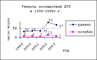 Источник: Бюллетень европейского Союза,дополнение 2/96, “К справедливому и эффективному ценообразованию на транспорте ” Тяжесть ДТПСогласно приведенных выше Диаграмм 1 и 2 в 2002г. наблюдался «всплеск» количества ДТП как следствие «всплеска» интенсивности движения на а/д «Подъезд к г. Северодвинску» в 2002г. (Диаграмма 3 ). Прирост количества учетных ДТП сопровождался ростом тяжести их последствий (см. Диаграмму 5 ).