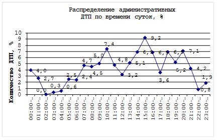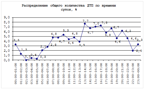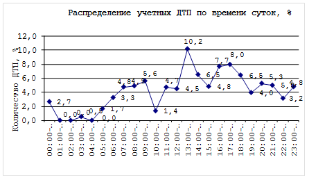 Диаграмма 10 Распределение по времени суток среднего количества учетных ДТП, произошедших на а/д «Подъезд к г.Северодвинску» за период 1999-2003гг. Диаграмма 10 показывает, что риск учетных ДТП на а/д «Подъезд к г.Северодвинску» неравномерен в течение суток, имея наибольшие значения в период с 13.00 до 14.00 (10,2%) и с 17.00 до 18.00.