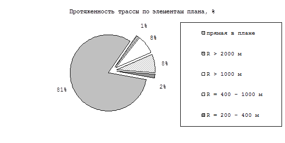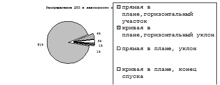 Диаграмма показывает, что 81% общей протяженности трассы представляет собой прямую в плане. Справка: Во всех странах отмечается следующая закономерность: сразу после проведения реконструкции дороги с устройством спрямлений и улучшением условий движения на дороге, количество ДТП и их тяжесть возрастают. Объяснение: прямые и широкие участки дороги провоцируют водителя к увеличению скорости движения. Распределение ДТП по элементам плана и профиля дорогиТаблица 10 приводит данные о распределении количества учетных ДТП, произошедших на а/д «Подъезд к г.Северодвинску» за период 1999-2003гг. в зависимости от элементов плана и профиля дороги. Таблица 10 Влияние элементов плана и профиля на распределение количества учетных ДТП, произошедших на а/д «Подъезд к г.Северодвинску» за период 1999-2003гг.