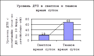 Отмечается, что на практике наблюдаемая закономерность может усугубляться под влиянием внешних факторов, например, при неблагоприятных погодных условиях, производстве дорожных работ и т.д. Статистические данные измерений фактических скоростей движения по пилотной дороге и влиянии их на аварийность отсутствуют. 6 Концентрация объектов придорожной инфраструктуры и меры, предпринятые для снижения риска от маневрирования транспортных средств вблизи этих объектов В настоящее время а/д «Подъезд к г. Северодвинск» придорожная инфраструктура представлена: · 3-мя действующими автозаправочными станциями и одной строящейся, · 2-мя придорожными кафе. Развивающиеся рыночные отношения неизбежно приводят к развитию придорожного сервиса и росту числа объектов сферы обслуживания. Большая часть существующих объектов на а/д «Подъезд к г. Северодвинск» тяготеют к населенным пунктам и представляет элементы повышенного риска ДТП. Ни одно из кафе не имеет подъезда обеспеченного элементами снижения риска (переходно-скоростные полосы и оборудованной парковки), что создает проблемы при маневрировании транспортных средств при подъезде/выезде к данным объектам. Для снижения риска возникновения ДТП необходимы правильное размещение объектов, их инженерное оборудование на стадии проектирования, устройство полос отгона для плавного отделения из основного потока при заезде на территорию объектов и плавном вливании в поток при выезде. Въезды на территорию объектов придорожной инфраструктуры являются примыканием к главной дороге, т.е. их размещение и обустройство регламентируется российскими СНиПами. 1.2.5 Влияние неблагоприятных внешних факторов на уровень ДТПОбщие данныеВнешние факторы увеличивают риск ДТП, усиливая нагрузку на психику человека, требуя мобилизации ресурсов организма для адаптации к непривычным условиям и принятия решений в нестандартных ситуациях. К внешним факторам, увеличивающим потенциальный риск ДТП, относятся: 1 Темное время суток, 2 Неблагоприятные погодные условия, 3 Опасное состояние дорожного покрытия, 4 Перегруженность дороги транспортными средствами, 5 Производство дорожно-ремонтных работ. Рассмотрим подробнее каждый из перечисленных факторов. 1 Темное время сутокУстановлено, что в темное время суток количество ДТП примерно в 1.5 – 3.5 раза выше по сравнению со светлым временем (См.Диаграмму 15 ). Возможно, плохая видимость не является единственной причиной, поскольку ночью за рулем может быть больше выпивших, утомленных, а поэтому, менее внимательных водителей. Неблагоприятные погодные условия ночью оказывают более негативное влияние, чем днем.
