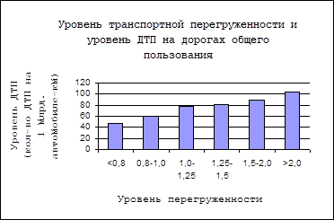 Диаграмма 19 Распределение количества учетных ДТП, произошедших на а/д «Подъезд к г.Северодвинску» за период 1999-2003гг. в зависимости от состояния покрытия проезжей части Таблица 15 показывает, что больше всего ДТП происходит на сухом покрытии. Скользкое покрытие сопутствовало 21% ДТП. В целом на мокром и скользком покрытии происходит 36% учетных ДТП (против 22% в Норвегии). Норвежский показатель ниже по причине более жестких требований относительно состояния шин (глубина рисунка протектора шины) и использования шипованых шин в зимнее время года. Отсутствие данных о состоянии покрышек и использовании шипованой резины в карточках учета ДТП на северодвинской дороге не позволяет оценить, каким образом состояние и тип покрышек влияет на аварийность. Имеющаяся статистика наводит на вывод, что риск ДТП на а/д «Подъезд к г. Северодвинску» является наименьшим на заснеженном покрытии и покрытии с накатом, поэтому, чем меньше проводится мероприятий по содержанию дороги - тем дорога безопаснее. А поскольку из мировой практики известно обратное, то следует: · усомниться в правильности заполнения карточек учета ДТП (указание состояния проезжей части), происходивших на рассматриваемой дороге за период 1999-2003г.; · предположить сознательное их заполнение со смягчением роли состояния покрытия в произошедших ДТП для того, чтобы предупредить подачу исков в суд на организацию, которая содержит дорогу. 4 Перегруженность дороги транспортными средствамиИзвестно, что вероятность ДТП увеличивается пропорционально интенсивности движения. Этому есть объяснения: Во-первых, чем больше участников дорожного движения, тем выше математическая вероятность конфликтных ситуаций. Во-вторых, движение в насыщенном транспортном потоке характеризуется повышенной нагрузкой на психику водителей, поскольку движение в таких условиях требует от водителя быстрой реакции, напряженного внимания, прогнозирования действий других водителей, а также ограничивает возможности для маневра. Возрастает количество ошибок участников дорожного движения, конфликтных ситуаций, что неизбежно приводит к росту количества ДТП (Диаграмма 20 ).