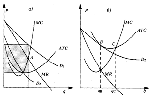 а) б) Рис 1. Равновесие фирмы-монополиста в долгосрочном периоде. 3. В отрасль входит достаточное количество конкурирующих друг с Другом фирм, так что каждая отдельная фирма проводит собственную ценовую политику, не взирая на реакцию конкурентов. Если рассмотреть рис. 1,б, то можно видеть, что, добившись равновесия в точке В (в долгосрочном периоде), фирма, действуй она в условиях совершенной конкуренции, обязательно увеличила бы выпуск продукции до уровня q с , поскольку в точке С она имеет мин. средние суммарные издержки (т. е. в точке С она бы получила макс.прибыль). Значит, в условиях монополистич. конкуренции производится более широкий ассортимент товаров, но с более высокими издержками на единицу товара, чем при соверш. конкуренции. Как показывает практика, третье условие монополистической конкуренции часто не выполняется. 2.4. Олигополия Олигополия является преобладающей формой современной рыночной структуры. Термин "олигополия" применяется в экономике для описания рынка, на котором существуют несколько фирм, отдельные из которых контролируют значительную долю рынка. На олигополистическом рынке конкурируют между собой несколько крупных фирм (от трех до пяти) и вступление на этот рынок новых фирм затруднено. Продукция, производимая фирмами, может быть как однородна, так и дифференцирована. Однородность преобладает на рынках сырья и полуфабрикатов: руды, нефти, стали, цемента; дифференциация – на рынках потребительских товаров (автомобили). Существование олигополии связано с ограничениями входа на данный рынок. Одно из них необходимость значительных капиталовложений для создания предприятия в связи с крупномасштабным производством олигополистических фирм. Сегодня общепризнано, что эффективным может быть предприятие, производящее не менее 500 тыс. легковых автомобилей в год, выплавляющее не менее 2,5 млн. т стали, и т.д. Немногочисленность фирм на олигополистическом рынке заставляет эти фирмы использовать не только ценовую но и неценовую конкуренцию, ибо последняя в такну условиях является более эффективной. Производители знают, что если они понизят цены, то их конкуренты сделают то же самое, что приведет к падению доходов. Поэтому вместо ценовой конкуренции, которая более результативна в условиях совершенной конкуренции, "олигополусы" используют неценовые методы борьбы: техническое превосходен во, качество и надежность изделия, методы сбыта, характер предоставляемых услуг и гарантий, дифференциацию условий оплаты, рекламу, экономический шпионаж. Характерная особенность олигополистического рынка зависимость поведения каждой фирмы от реакции и поведения конкурентов. Крупные размеры и значительный капитал фирм крайне немобильны на рынке, и в этих условиях наибольшие выгоды обещает именно сговор между олигополистическими фирмами в целях поддержания цен и максимизации прибыли Производители договариваются и сотрудничестве и заключают (иногда открытое и даже оформленное) соглашение о дележе рынка – "картельное соглашение". Картель представляет собой соглашение нескольких предприятий, устанавливающее для всех участников объем производства, цены на товар, условия найма рабочей силы, обмена патентами, разграничение рынков сбыта и долю ("квоту") каждого участника в общем объеме производства и сбыта. Его целью явля