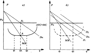 а) б) Рис. 3. Неизменность цен при варьировании спроса Так как любая фирма максимизирует свою прибыль при MR=MC, а кривые AVC и МС совпадают, что соответствующие значения цены и объема находятся по точке А пересечения кривых MR и AVC. Цена Рn – «нормальная» цена. Она берется за основу и в случае изменений спроса (кривые D1 и D2 на рис. 3,б) не меняется, а объемы продукции уменьшаются (до q1) или увеличиваются (до q2) . Следует иметь в виду, что удержание цен целесообразно, если в определенных рамках объема выпуска удается сохранять неизменными средние переменные издержки. Когда фирма имеет классическую U-образную кривую AVC , попытки удержать цену и сократить объем производства (при падении спроса) приведут к потерям. 3. Конкуренция в России. 3.1 Особенности российского монополизма. Конкуренция стимулирует технический прогресс, способствует развитию экономики, продвижению отечественных товаров на мировой рынок. Созданию полноценной конкурентной среды в нашей стране мешает засилье монополий, несовершенство антимоноп. законодательства и многое другое. Монополии существуют во всём мире. Своеобразной монополией в бывшем СССР была командная экономика, построенная на всеобъемлющем директивном планировании, государственном ценообразовании, централизованном распределении материальных ресурсов и по самой своей природе не допускавшая конкуренции ни в одной своей части. Внутри этой экономики существовал монополизм центральных ведомств, министерств и предприятий, которые не были независимыми хоз. субъектами. Жизненно важные параметры их деятельности устанавливал Госплан, Госснаб и Госкомцен. Советской экономике была свойственна непропорционально высокая доля крупных и крупнейших предприятий и чрезвычайно малая доля мелких и средних по сравнению с развитыми странами. В СССР в 1987 г. на одно промышленное предприятие приходилось в среднем 813 рабочих мест, в Венгрии – 186, в Западной Европе – 86. Наиболее высокой была концентрация производства в металлургии, машиностроении, химической и текстильной отраслях. Нередко ту или иную продукцию выпускало одно-два предприятия, которые диктовали свои условия потребителю. Плохое качество товаров, завышенные цены мало сказывались на изменении спроса в условиях постоянного дефицита и отсутствия выбора поставщиков. Но социалистические монополии существенно отличались от капиталистических аналогов. Капиталистические монополии возникали «снизу» в результате конкурентной борьбы, а социалистические насаждались «сверху» и действовали в тепличных условиях. В монополисты при капитализме прорывается предприятие-лидер, который использует передовые технологии, имеет значительный производственный и научно-технический потенциал. Капиталистические монополии, участвуя в международном разделении труда, вынуждены для повышения конкурентоспособности улучшать кач-во продукции, что положительно сказывается и на внутреннем рынке, социалистич. ограничивались в лучшем случае региональными рамками. Специфика российских монополий сказалась и на особенностях законодательного регулирования их деятельности. В капиталистических странах монополии появились тогда, когда уже существовали рыночные отношения, и государство, чтоб воспрепятствовать удушению конкуренции, стало вводить ограничивающие нормы. Российско