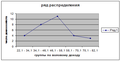 Рис. 12. График ряда распределения по полученным 5 группам. По графику определяем моду и медиану, в нашем случае они совпадают – это самая верхняя точка графика, она принадлежит 3 группе (46,1 – 58,1) и имеет частоту в 11 домохозяйств. Построив итоговую таблицу (графа w – доля домохозяйств с частотой f; Вычисляем среднюю арифметическую по исходным данным: для этого складываем все значения валового дохода на 1 члена домохозяйства в год и делим на количество всех домохозяйств Средние арифметические отличаются, так как в первом случае мы находили взвешенную среднюю (в качестве веса выступало число домохозяйств в данной группе), а во втором простую среднюю по несгруппированным данным. Таким образом, в данной курсовой работе были рассмотрены такие вопросы, как сущность закона распределения и его виды; статистическая оценка законов распределения; понятие «уровень жизни населения и его показатели», практическое применение законов распределения при изучении уровня жизни населения. По первому вопросу можно сделать следующие выводы. Уровень жизни является одной из важнейших социальных категорий, которая характеризует потребности человека и возможности их удовлетворения. Важнейшими составляющими уровня жизни выступают доходы населения и его социальное обеспечение, потребление им материальных благ и услуг, условия жизни. Важнейшая задача статистики уровня жизни – выявление закономерностей изменения благосостояния населения. Для этого проводятся исследования, охватывающие как всю страну, так и ее регионы, социально-демографические группы населения и различные типы домашних хозяйств. Это позволит проследить различия в уровне жизни в зависимости от экономических, национальных, природно-климатических и других особенностей, а также от доходов населения. Результаты исследования могут носить либо общий характер, либо частный, связанные, например, с оценкой потребления населением конкретных благ и обеспеченности его различными услугами. Повышение уровня жизни – это не только результат экономического роста, но и его условие. Законы распределения представляют собой один из наиболее важных элементов статистического исследования. Законы распределения являются базисным методом для любого статистического анализа. Изучив основные приемы исследования и практики применения законов распределения, а также методику вычисления наиболее важных статистических величин, необходимо отметить, что конечная цель изучения статистики в целом - анализ изучаемого явления, который крайне важен для всех сфер человеческой жизни. Анализ отображает явления в целом и вместе с этим учитывает влияние каждого фактора в отдельности. На основании проведенного анализа можно учитывать и прогнозировать факторы, негативно влияющие на развитие событий. Социально-экономическая статистика обеспечивает предоставление важной цифровой информации об уровне и возможностях развития страны: ее экономическом положении, уровне жизни населения, его составе и численности, рентабельности предприятий, динамике безработице и т.д. Статистическая информация является одним из решающих ориентиров государственной экономической политики. Статистические методы используют комплексно (системно). Выделяют три основные стадии экономико-статистического исследования: сбор пер