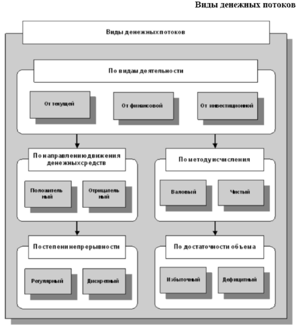 Таблица 1. Виды денежных потоков Движение денежных средств осуществляется по трем видам деятельности: - текущая (основная, операционная) деятельность; - инвестиционная деятельность; - финансовая деятельность. Текущая (основная, операционная) деятельность – деятельность организации, преследующая извлечение прибыли в качестве основной цели, либо не имеющая извлечение прибыли в качестве таковой в соответствии с предметом и целями деятельности,т.е. производством промышленной, сельскохозяйственной продукции, выполнением строительных работ, продажей товаров, оказанием услуг общественного питания, сдачей имущества в аренду и др. Инвестиционная деятельность – деятельность организации, связанная с приобретением земельных участков, зданий, иной недвижимости, оборудования, нематериальных активов и других внеоборотных активов, а также их продажей; с осуществлением собственного строительства, расходов на научно-исследовательские, опытно-конструкторские и технологические разработки; с осуществлением финансовых вложений. Финансовая деятельность – деятельность организации, в результате которой изменяются величина и состав собственного капитала организации, заемных средств.