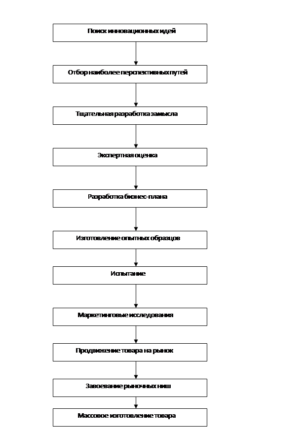 Инновационное предпринимательство имеет дело с созданием, освоением и коммерческим использованием нового продукта или услуги. Этот процесс включает в себя ряд этапов: - поиск новой идеи, ее оценку, составление бизнес-плана; - поиск необходимых ресурсов, создание опытного образца и испытания; - изучение рынка сбыта и продвижение товара на рынок. Основные этапы разработки товара-новинки представлены на рис.2