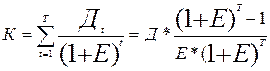 где FV (Future Value)- будущая величина депозита; PV(Present Value)- текущая, или современная, величина вложений; К- прибыльность на инвестиции(%); n- число стандартных периодов. Формула связи между номинальной и реальной банковскими ставками имеет вид: N=(1+I)*(1+R)-1 - зависимость номинальной ставки от реальной R=(N-I)/(1+I) - зависимость реальной ставки от номинальной где I - уровень инфляции Если рентабельность инвестиций (она описана ниже) выше процентной ставки банка, то это свидетельствует о целесообразности осуществления данного проекта, в противном случае деньги лучше положить в банк и ожидать дивиденды. В случае получения денежных средств в кредит, полученная расчетная экономическая прибыль должна быть уменьшена на величину уплачиваемых процентов, определяемых по формуле: где К-сумма кредита T-срок, на который предоставлен кредит Е- процент кредита Правая часть формулы с точки зрения кредитора не должна быть меньше, чем левая, иначе ему не выгодно отдавать свой капитал в кредит, а с точки зрения заемщика (в данном случае предприятия) - правая часть не должна быть больше левой, поскольку в противном случае ему придется отдавать больше денежных средств, чем он их получил. Их интересы удовлетворяются, если выполняется равенство и обеспечивается обмен суммы кредита на эквивалентные этой сумме платежи. Простой срок окупаемости инвестиций. Простой срок окупаемости инвестиций заключается в определении необходимого для возмещения инвестиций периода времени, за который ожидается возврат вложенных средств за счет доходов, полученных от реализации инвестиционного проекта. Известны два подхода к расчету срока окупаемости. Первый заключается в том, что сумма первоначальных инвестиций делится на величину годовых (лучше среднегодовых) поступлений. Его применяют в случаях, когда денежные поступления равны по годам. Второй подход расчета срока окупаемости предполагает нахождение величины денежных поступлений (дохода) от реализации инвестиционного проекта нарастающим итогом, т.е. как кумулятивной величины (срок окупаемости подсчитывается суммированием годичных денежных поступлений до тех пор, пока результат не станет равным сумме инвестиций). Период окупаемости инвестиций Ток определяют и как отношение величины начальных инвестиций (капитальных вложений) Кк ожидаемой чистой прибыли П или разности между годовыми доходами Д и затратами 3 (без амортизации), т.е.: Ток = К/(Ц-3 +, А) = К/(П + А), где А - сумма амортизационных отчислений на полное восстановление. Основные преимущества этого метода (кроме простоты понимания и расчетов) - определенность суммы начальных инвестиций, возможность ранжирования проектов по срокам окупаемости, а следовательно, и по степени риска, так как чем короче период возврата средств, тем больше денежные потоки в первые годы реализации инвестиционного проекта, а значит, лучше условия для поддержания ликвидности предприятия. А чем больший срок нужен для возврата инвестиционных сумм, тем больше риска из-за неблагоприятного развития ситуации. Метод окупаемости отражает период ожидания инвестором, пока его вложения полностью не окупятся. Он дает представление, в течение какого периода времени инвестор будет рисковать своим капиталом. И это важно, поскольку предсказать более или менее точно будущие результаты невозможно. Здесь нео