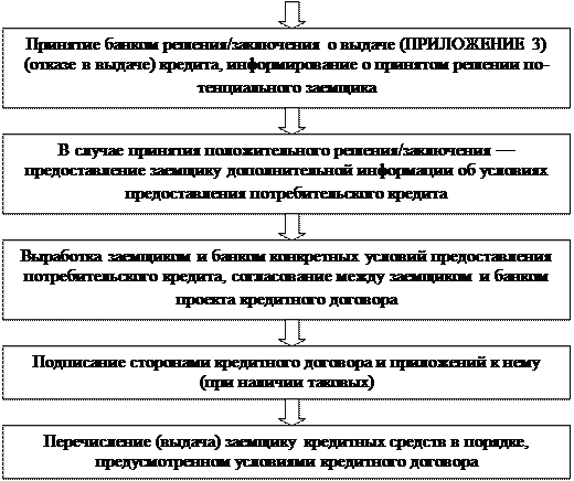 | ОГЛАВЛЕНИЕ 1. Организация и оформление кредитования физических лиц 4 1.1. Сущность потребительского кредита. 4 1.3. Понятие кредитоспособности заемщика. 15 1.4. Формы обеспечения по кредитованию физических лиц. 17 1.5. Технология и схема предоставления кредита. 18 1.6. Порядок погашения кредита. 21 2. Учет предоставленных кредитов физическим лицам 23 2.2. Учет операций по выдачи и погашению кредитов, предоставленных физическим лицам.. 27 2.3. Учет операций по начислению и погашению процентов по кредиту 29 2.4. Учет просроченной задолженности по кредитам и процентам.. 29 2.5. Учет операций по созданию резерва на возможные потери по ссудам 30 2.6. Учет обеспечения по предоставленным кредитам.. 32 ПРИЛОЖЕНИЕ 1 «Кредитный договор». 34 ПРИЛОЖЕНИЕ 2 «Заявка на предоставление кредита». 38 ПРИЛОЖЕНИЕ 3 «Заключение о выдаче кредита». 41 ПРИЛОЖЕНИЕ 4 «Платежный календарь». 44 ВВЕДЕНИЕПотребительский кредит занимает особое место в общей банковской системе и играет немаловажную роль в современной рыночной экономике. В настоящее время проблеме потребительского кредитования уделяется большое внимание в связи с тем, что в условиях мирового финансового кризиса кредитным организациям пришлось поменять политику предоставления потребительского кредита. Ужесточились требования к заемщикам, повысились процентные ставки по кредитам, означающие теперь практический отказ в выдаче кредита, прекратилась выдача кредитов с нулевым или минимальным первоначальным взносом, увеличился размер первоначального взноса до 30 % от суммы кредита, сократились, а некоторыми банками и вовсе прекратились, ипотечные программы и программы автокредитования. Целью данной курсовой работы является изучение организации и оформления кредитования физических лиц. Цель исследования обусловила постановку и решение следующих задач: - изучить сущность потребительского кредитования; - на основе изучения опубликованных источников проследить виды потребительского кредитования и описать их классификации; - охарактеризовать понятия кредитоспособности заемщика и формы обеспечения по кредитованию физических лиц; - раскрыть технологию и схему предоставления потребительского кредита, а также порядок его погашения; - описать порядок бухгалтерского учета предоставленных кредитов физическим лицам. Объект исследования: кредитование физических лиц в Российской Федерации. 1. Организация и оформление кредитования физических лиц 1.1. Сущность потребительского кредитаПроцесс кредитования, по мнению специалистов банковского дела, представляет собой передачу денег или материальных ценностей одной стороной (заимодавцем или кредитором) другой стороне (заемщику) на условиях возвратности, платности и срочности. Кредит является договором займа по поводу предоставления денежных средств или товарно-материальных ценностей на определенных условиях (плата процентов, срок возврата) с целью обеспечения хозяйственной деятельности, удовлетворения потребностей в предоставляемых вещах и т.п. Потребительский кредит, является одной из форм кредита и служит средством удовлетворения различных потребительских нужд населения. В определенной степени он содействует выравниванию потребления групп населения с различным уровнем доходов. Потребительский кредит представляет собой продажу торговыми предприятиями потр
