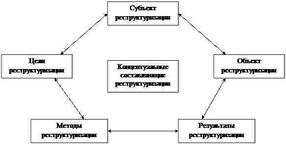 Субъектами реструктуризации (теми, кто проводит реструктуризационные преобразования) являются персонал и руководители подразделений организации, руководство предприятий, органы управления всех уровней власти, в том числе отраслевые министерства и ведомства, руководители крупнейших отраслевых объединений, руководители органов власти субъектов Российской Федерации и местного самоуправления. Всех субъектов реструктуризации сближает наличие общих прав и обязанностей: определенный набор полномочий и ответственность за принимаемые управленческие решения. Соответствие субъектов и объектов реструктуризации показано в табл. 3. В теории менеджмента говорится о том, что четко поставленная цель может обеспечить как минимум 50% успеха в ее достижении. Отечественным предприятиям не достает именно ясных ориентиров деятельности. Без направленности на конкретный результат, на решение определенной проблемы итоги реструктуризации могут не соответствовать запланированным. В зависимости от того, какие цели и задачи ставит перед собой руководство предприятия, все виды и формы реструктуризации можно объединить в следующие группы: 1. Так как цели предприятия могут быть долгосрочными (стратегическими) и краткосрочными (оперативными), говорят о стратегической и оперативной реструктуризации. 2. В задачи реструктуризации может входить решение проблем конкретной функциональной области деятельности организации, в этом случае реструктуризация может быть управленческой, производственной, маркетинговой, финансовой, кадровой. 3. Если цель реструктуризации – решение проблем, обусловленных факторами макросреды, то реструктуризация будет внешней, факторами микросреды предприятия – внутренней. 4. Реструктуризация может быть направлена как на предупреждение кризисных явлений (превентивная реструктуризация), так и на их преодоление (кризисная реструктуризация). Для достижения поставленных целей необходим определенный набор инструментов и методов реструктуризации. Поскольку реструктуризация носит комплексный, фундаментальный, всеохватывающий характер, то и спектр возможных методов реструктуризации чрезвычайно широк. Сюда можно отнести все методы финансового, кадрового, производственного, инвестиционного менеджмента, логистики, управленческого учета, контроллинга и маркетинга. Еще одним элементом реструктуризации предприятия являются конкретные результаты ее проведения, которые не всегда полностью соответствуют поставленным ранее целям. Анализ результатов и эффективности того или иного управленческого решения является одним из важнейших этапов реструктуризации. Без соответствующего контроля невозможно правильно оценивать уровень достигнутых показателей, корректировать политику предприятия и планировать действия на будущее. Современные методы управленческого учета, контроллинга, экономического анализа, аудита позволяют своевременно отслеживать возникающие в ходе реструктуризации отклонения фактических значений показателей финансово-хозяйственной деятельности от запланированных и выявлять причины этих отклонений. Таким образом, концептуальными составляющими реструктуризации деятельности промышленного предприятия являются субъект, объект, цели, методы и результаты реструктуризации (рисунок). Для успешн