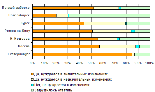 Рис. 1. Распределение ответов на вопрос «Нуждается ли в изменениях закон РФ «О государственной поддержке малого предпринимательства в РФ» Из 75,1% респондентов, которые смогли дать определенную оценку Закону РФ «О государственной поддержке малого предпринимательства» только 1,7% посчитали, что он не нуждается в изменениях. Во всех региональных группах, кроме представителей Екатеринбурга, этот ответ поддержало от 3% до 1% предпринимателей. В Екатеринбурге не нашлось ни одного респондента, разделяющего это мнение. Все остальные, а это 73,4% ответивших, заявили, что закон нуждается в изменениях. Несколько более половины опрошенных предпринимателей (52,0%) дали ответ: «Да, нуждается в значительных изменениях». Причем, наиболее радикально настроены предприниматели из Екатеринбурга, где за значительные изменения закона выступило 84,7% всех представителей региона. Самыми умеренными в этом вопросе оказались предприниматели Новосибирска, где поддержать значительные изменения закона готовы 20,0% участников опроса из этого города. Остальные регионы не имели существенных различий (от Москвы, где за значительные изменения проголосовало 57,0% москвичей, до Курска, где таких голосов 43,8%). С тем, что закон «О государственной поддержке малого предпринимательства в РФ» нуждается в незначительных изменениях, согласились 21,4% опрошенных предпринимателей из всех шести регионов. Наибольшее число поддержавших эту точку зрения оказалось в трех регионах: Курск (35,4% опрошенных в Курске); Ростов-на-Дону (33,0% ростовчан); Москва (31,0% москвичей). За то в Екатеринбурге за незначительные изменения проголосовало всего 2% предпринимателей, в Новосибирске несколько больше – 10%, а в Нижнем Новгороде – 16,5%. Поскольку содержание поправок и изменений должно позволить решить многочисленные проблемы в осуществлении государственной поддержки субъектов малого бизнеса, обеспечить рост ее эффективности, а самое главное, удовлетворить реальные запросы и ожидания предпринимателей, существенным является вопрос о том, кто должен быть автором этих поправок, кто сможет реализовать в данном случае интересы предпринимателей. В ходе исследования выяснялось мнение представителей малого бизнеса отдельных регионов относительно поставленных вопросов. На вопрос о том, кто должен разработать юридически грамотные формулировки поправок к Закону РФ «О государственной поддержке малого предпринимательства в РФ» в интересах предпринимателей, респонденты достаточно единодушно ответили: «Юристы-профессионалы» (рис. 2). С этой точкой зрения согласилось 76,3% опрошенных. За профессионалов выступили практически все представители Новосибирска (94,0%). Другие регионы продемонстрировали отсутствие различий, за исключением Ростова-на-Дону, где только 63,0% выразили согласие с этой позицией. Практически равноценной силой представляются в данном процессе сами предприниматели. Вторым по значимости оказался ответ «Предприниматели (их союзы, объединения)». Так ответили 70,7% всех опрошенных предпринимателей. Наибольшее количество согласных с этой точкой зрения оказалось среди москвичей (88,9%) и среди представителей Новосибирска (76,5%). Более сдержанно к этой альтернативе отнеслись в Ростове-на-Дону (64,0% поддержавших) и Нижнем Новгороде (63,3%). Все остальные варианты ответов получили значительно менее суще