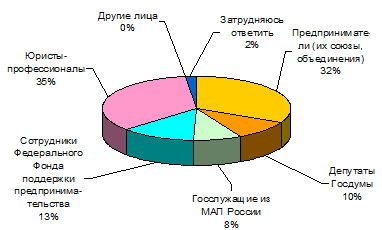 Рис. 3. Распределение ответов предпринимателей на вопрос: «Из каких источников должна оплачиваться разработка поправок к закону?» Второе место занял вариант «Из средств госбюджета на содержание МАПа». Его выделили 40,9% предпринимателей. Больше всего сторонников у варианта оказалось в Москве (53,6%), а меньше – в Нижнем Новгороде (40,0%). На третьем месте предложение оплачивать разработку поправок «Из средств предпринимателей (их союзов, объединений)» – его поддержали 14,8% опрошенных, среди которых больше всего представителей Новосибирска (23,7%) и Нижнего Новгорода (22,4%). Положительное отношение у 10,7% опрошенных встретила идея оплачивать работу «Из средств международных организаций и фондов». Значительную поддержку идея получила в Нижнем Новгороде, где за нее проголосовало 23,5% предпринимателей. Не имеют определенного мнения по поводу источника финансирования необходимых работ 9,6% опрошенных предпринимателей. Больше всего затруднившихся с оценкой в Нижнем Новгороде (18,8%). Таким образом, опрос подтвердил, что потребность в изменениях законодательной базы малого бизнеса, и, в частности, Закона РФ «О государственной поддержке малого предпринимательства в РФ», очень высока и осознана представителями малого бизнеса. Острота проблемы для предпринимателей проявляется настолько, что они выражают готовность участвовать в ее решении, занимаясь непосредственной разработкой поправок и даже финансированием необходимых работ. Результаты исследования, на наш взгляд, не потеряли своей актуальности и сегодня, в условиях серьезной трансформации всей системы государственной поддержки малого предпринимательства на федеральном уровне. Предоставление возможности малым предприятиям участвовать в выполнении государственных заказов рассматривается в качестве одного из направлений поддержки малого предпринимательства и является одним из механизмов поддержки МП путем развития локальных рынков товаров и услуг. Поскольку специфика деятельности малых предприятий, в частности, масштабы применяемых средств производства и финансовых ресурсов, узкая специализация деятельности, упрощенная схема сбыта произведенной продукции и т.д., обуславливают преимущественную ориентацию МП на локальные рынки, качество этих локальных рынков в значительной степени формирует внешнюю среду малого предпринимательства. Для субъектов малого бизнеса участие в выполнении государственных и муниципальных заказов является важным фактором обеспечения гарантий сбыта продукции, расширения доступа к источникам приобретения ресурсов, новым технологиям, информации о конъюнктуре рынка. Таким образом, привлечение к выполнению заказов государственных и муниципальных органов власти и управления способствует устойчивости МП, дает гарантию некоторой стабильности, создает определенные условия для развития и потому является чрезвычайно привлекательным для предпринимателей. Сами по себе государственные заказы со стороны федеральных, региональных органов власти, являясь инструментом поддержки отдельных малых предприятий, могут отрицательно влиять на состояние локальных рынков, поскольку неотработанность механизмов размещения заказов фактически приводит к усилению монополизма, дискриминации отдельных хозяйствующих субъектов, нарушению конкурентной среды и,