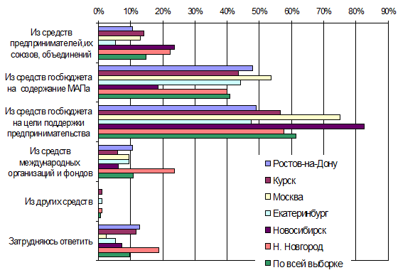 Рис. 2. Распределение ответов на вопрос «Кто должен разрабатывать формулировки поправок к Закону РФ «О государственной поддержке малого предпринимательства в РФ» С тем, что формулировки поправок к Закону должны разрабатывать сотрудники Федерального Фонда поддержки предпринимательства, согласились 28,1% предпринимателей, участвовавших в опросе. Лидерами среди них оказались три региона: Ростов-на-Дону (36,0%); Москва (35,4%) и Нижний Новгород (34,7%). Минимальное количество согласных с этой точкой зрения оказалось в Курске (15,6%) и Новосибирске (19,2%). Отдать разработку поправок к Закону депутатам Госдумы согласно 22,4% предпринимателей. Наибольшее доверие вызывают депутаты у предпринимателей из Екатеринбурга, где более половины (52,0%) опрошенных считают, что именно они должны заниматься поправками к Закону. Совершенно иная картина в Ростове-на-Дону, где только 6,0% поддержали эту идею. Предложение передать разработку поправок к Закону РФ «О государственной поддержке малого предпринимательства в РФ» государственным служащим из Министерства по антимонопольной политике и поддержке предпринимательства (МАП России) поддержали только 18,0% предпринимателей. Среди регионов наиболее положительно к нему отнеслись Москва, отдавшая в поддержку 29,3% голосов, и Ростов-на-Дону, где оказалось 20,0% поддержавших. У предпринимателей при определении позиции по этому вопросу практически не возникало затруднений (4,2% не определились с ответами). Среди регионов «первенство» по затруднениям с ответом на этот вопрос оказалось у Нижнего Новгорода (7,1%) и Ростова-на-Дону (7,0%). Не было трудностей у Москвы и Новосибирска. Другие лица и структуры для разработки поправок предпринимателями не предлагались. Интересным было также мнение представителей малого бизнеса о том, из каких источников должна оплачиваться работа по совершенствованию закона о государственной поддержке предпринимательства. Несмотря на то, что недостаточное финансирование господдержки приводит к тому, что предприниматели практически не получают ее, респонденты проявили понимание приоритетности полноценной законодательной базы и, в большинстве своем, сочли, что на эту работу должны быть направлены финансовые средства, выделенные на господдержку малого бизнеса. На вопрос об источниках оплаты разработки поправок к Закону РФ «О государственной поддержке малого предпринимательства в РФ» большинство предпринимателей (61,3%) указали на вариант «Из средств госбюджета на цели поддержки предпринимательства». Наибольшее число сторонников этого варианта оплаты оказалось в Новосибирске (82,5% от общего количества опрошенных в Новосибирске предпринимателей) и Москве (75%). Наименьшую поддержку этот вариант получил в Екатеринбурге (47,4%). Распределение ответов представлено на рисунке 3.