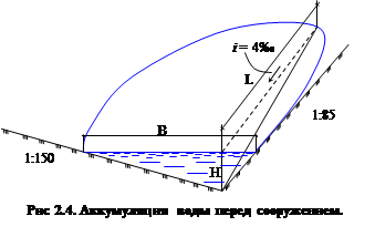 3. Для ряда значений H (с интервалом 0,5 м) в форме таблицы вычисляются объемы пруда аккумуляции Wпр , м3 , по формуле: где H — максимальная глубина в пониженной точке живого сечения при расчетном уровне подпертых вод, м; m1 , m2 , i л — крутизна склонов лога и его уклон. А также расчетный расход Qс по формуле: где Qл — максимальный расход дождевых вод, м3 /с, определяемый по формуле (1); Wпр — объем пруда аккумуляции перед сооружением, м3 , вычисляется по формуле (14); W — объем ливневого стока, м3 , вычисленный по формуле (13); Kr — коэффициент, учитывающий форму расчетного гидрографа паводка. Для немуссонных районов равен 0,7.