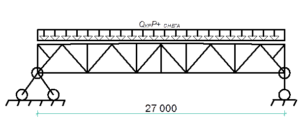 Необходимо рассчитать и законструировать стропильную ферму покрытия пролётом 27 м. Шаг ферм 8 м, сечение элементов решетки фермы выполнены из парных уголков, пояса из тавров. Покрытие тёплое. Климатический район по снеговому покрову –