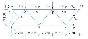 Рис. 6. Размеры элементов фермы и усилия в них Таблица 2 Расчетные усилия в элементах фермы