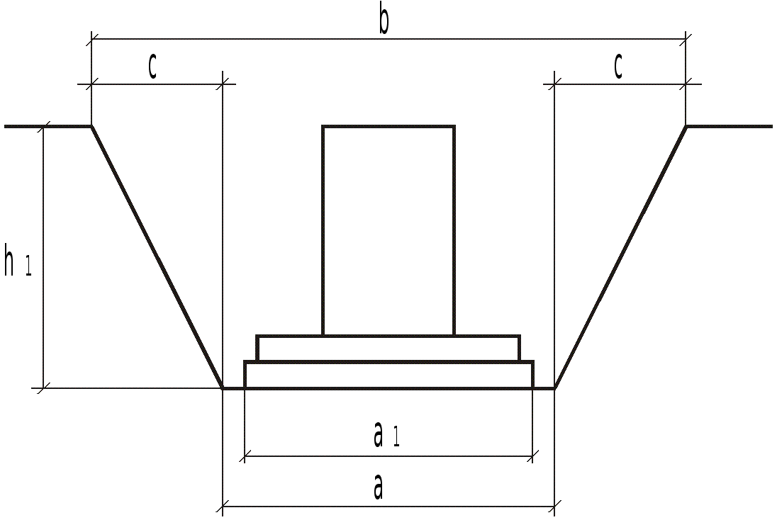 а1- ширина первой подошвенной плиты; а = a1 + 1,2м - дно выемки (котлована); b = a + 2*с – ширина котлована сверху; h1 – глубина требуемого котлована; c = 0,5*h1 – ширина откосов.