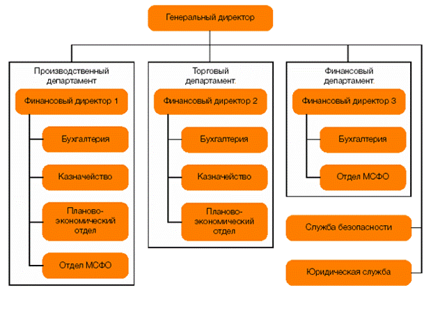 Кроме того, в структуре финансового департамента можно выделить отдел налогового планирования, хотя его функции может выполнять юридическая служба холдинга при условии, что ее сотрудники будут достаточно квалифицированы для этого. При переводе холдинга на единую акцию необходимость финансовой работы на местах резко снижается, поэтому в регионах в каждом дочернем предприятии имеет смысл оставить одного-двух бухгалтеров (для осуществления и учета расходов согласно утвержденному центром бюджету и составления ежемесячной отчетности для передачи в центральный офис) или же отдать учетную функцию на аутсорсинг. Именно такую структуру управления попытались организовать собственники холдинга «Агроном», однако практика внесла в нее свои коррективы. Проблемы на практике Региональная специфика. Переход предприятий холдинга на единую акцию предполагал их перерегистрацию и перевод из регионов в Москву. Это привело бы к тому, что бюджеты регионов лишились налоговых поступлений, зачастую довольно значительных. Поэтому региональные власти приложили все усилия, чтобы не допустить перерегистрации. В итоге в подразделениях холдинга, которые не удалось юридически перевести в Москву, необходимо было организовывать бухгалтерию для составления и сдачи официальной отчетности. Дело усугубилось сложной кадровой ситуацией в регионах. Агропромышленныепредприятия холдинга расположены в небольших населенных пунктах, поэтому найти там квалифицированных бухгалтеров, владеющих компьютером, которые должны были обеспечивать своевременную сдачу отчетности в головной офис, оказалось очень трудно. Кроме того, собственники потребовали от предприятий составлять отчетность по стандартам МСФО. Возникла необходимость держать в штате региональных компаний высокооплачиваемых специалистов, способных выполнять эти функции. В результате минимизировать штат финансовых служб на местах не удалось. Несогласованность действий. Приступив к реформам в организационной структуре холдинга, собственники не согласовали свои позиции. Это привело к постоянным кадровым перестановкам и частой смене финансового и генерального директоров холдинга. В то же время на постах руководителей производственного и торгового департаментов холдинга стояли сильные менеджеры, которые постарались обезопасить свои подразделения от негативных изменений. Они создали службы для осуществления функций, которые не выполнял финансовый департамент холдинга. У каждого подразделения появились казначейство, производящее платежи и привлекающее кредиты, и финансовые директора, которые занимались составлением отчетности, бюджетированием, экономическими расчетами для руководства департамента. По сути, появились финансовые службы бизнес-направлений, которые действовали независимо друг от друга. Руководство финансами региональных производств взяла на себя финансовая служба производственного департамента, которой фактически удалось добиться централизованного управления финансами. Производственный департамент, специалисты которого выстроили вертикальную цепочку управления производством в регионах, снабжением и т. п., в новой структуре стал выполнять роль корпоративного центра. В результате организационная структура холдинга приобрела совершенно иной вид по сра
