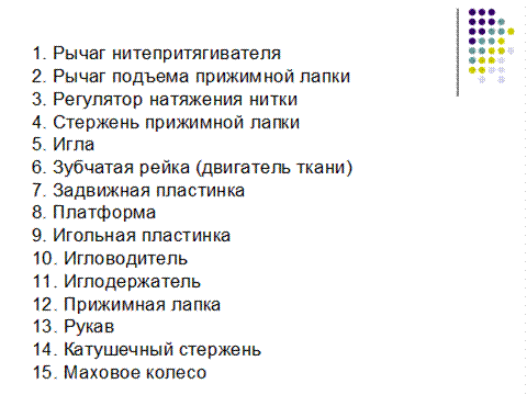 1. Беседа. Прежде, чем мы начнем разговор по теме сегодняшнего урока, мне бы хотелось спросить: какие машины вам известны и какое значение они имеют в вашей жизни других людей. 2. Вступительное слово учителя. Без машины трудно представить сегодняшний день. Жизнь кажется без них невозможной: обувь, одежда, дома, мебель, посуда и т. д. – все это результат деятельности машин, созданных человеком себе в помощь. Что же такое машина? (Машина – это устройство, которое оказывает человеку помощь в работе: заменяет его руки, ноги, помогает считать, писать, чертить и многое другое). Швейная машина одна из немногих помогающих человеку. Раньше, лет двести тому назад, вся одежда шилась вручную. Это далеко не лёгкий труд. Вот и появилась необходимость облегчить его. Первые машины появились в Англии в конце 18 века. Эти машины были несовершенными и малопроизводительными. Постепенно они совершенствовались и приобрели современную форму. До 20 века в России машины не производились. Существовали лишь небольшие мастерские, занимавшиеся сборкой машин из деталей, которые привозились главным образом из-за границы. Первый завод по производству швейных машин в нашей стране был построен в 1923 году в городе Подольске Московской области. После ВОВ машины стали производиться в Белоруссии, в городе Орше. Швейная машина значительно облегчила шитьё одежды. При помощи машины работа выполнялась в 50 раз быстрее, чем вручную. Швейные машины бывают бытовые и промышленные. Промышленные предназначены для швейных фабрик, а бытовые для домашнего обихода. Вот с устройством и принципами работы бытовых швейных машин нам и предстоит с вами познакомиться. 3. Демонстрация. В зависимости от того, как приводится в движение швейный механизм, машины подразделяются на ручные, ножные и с электрическим приводом. Машины состоят из различных деталей, название которых надо знать, чтобы понимать друг друга во время совместной работы. А не называть их «штучками» и прочими неподходящими словами. 4. Работа в группах. Сейчас мы познакомимся с устройством машин. Задание №1: В пакете набор этикеток с названием деталей машины (деталь – изделие, изготовленное из какого-нибудь одного материала; её нельзя разделить на составные части) с ножным приводом. Всего их 20. Предлагаю разбиться на группы по 3-4 человека и разложить этикетки с названиями на предполагаемые детали. (В данном случае полагаюсь на интуитивный опыт учащихся). Задание № 2: Получив письменные пояснения по местоположению деталей и выполняемым ими функциям , попробуйте исправить свои ошибки. Этикетки с названиями ненайденных деталей отложите в сторону. (Как правило, не могут найти только главный вал, скрытый от глаз учеников корпусом машины). Задание № 3. Даются схемы строения машины, вывешивается таблица. И вот уже в третий раз слово группам: назовите детали. Самоконтроль в группах (этикетки делятся поровну между девочками и каждая, называя детали, получает предварительную оценку группы). 5. Контрольный ответ учителю на оценку. 6. Итог. Я верил в вас, знала, что вы справитесь. Значит, и шитьё у нас пойдет хорошо. Но перед тем как вы сядете за машины, я сообщу еще вам некоторую информацию и научу приемам безопасной работы на машине. 7. Инструктаж по ТБ: