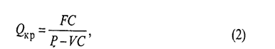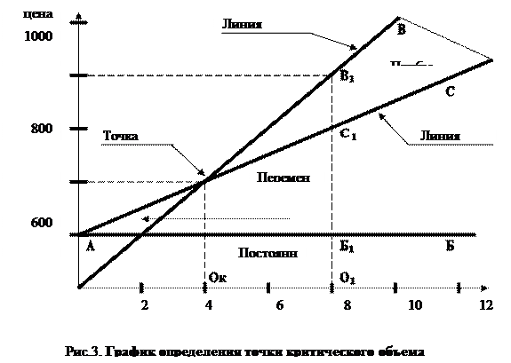 где Qкр — объем производства продукции в критической точке (количество единиц); Р — цена единицы продукции; VС — удельные переменные затраты на единицу продукции; FС — постоянные расходы. В прямоугольной системе координат строится график зависимости затрат и дохода от количества единиц произведенной продукции (см. рис.). По вертикали откладываются данные об издержках и доходе, по горизонтали — количество единиц продукции. Порядок построения графика следующий: 1. Чтобы нанести на график линию переменных расходов (VС), выбираем любой объем, предположим, 500 ед. и находим точку расходов, соответствующую этому объему: Проводим линию переменных расходов через точки 0 и A. 2. Чтобы нанести линию постоянных расходов (ТС), отметим на оси ординат точку, соответствующую 70 000 ед. (точка В), а от точки А вверх отложим 70 000 ед. (точка С). Используя точки В и С, проводим линию постоянных расходов параллельно линии переменных расходов. Линия ВС показывает общую сумму затрат.