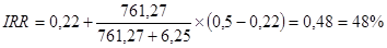 Из таблицы 3.12 можно проследить за оставшейся прибылью на предприятии по годам, т. е. в какие года она была минимальной, в какие – максимальной. Предприятие понесло убытки в первом году (14,8 тыс. руб.), а максимальной прибыль была в третьем году (685,62 тыс. руб.). По формуле (3.2), приведенной выше, находим чистый дисконтированный доход (NPV). где J0 - первоначальные инвестиции, 1000 тыс. руб., Pt - денежный поток доходов в конце t -го периода (доходы от операционной деятельности), i – коэффициент дисконтирования, 22%. Чистый дисконтированный доход: NPV = 761,27. Индекс доходности, рентабельности инвестиций (PI), вычисляемый по формуле (3.3), будет равен: PI= 1761,27 / 1000=1,76. Возьмем значения процентных ставок в дисконтных множителях, для которой NPV (i1 ) > 0 и NPV (i2 ) < 0. При i1 = 22%, NPV = 761,27 > 0; При i2 = 50%, NPV = -6,25 < 0.