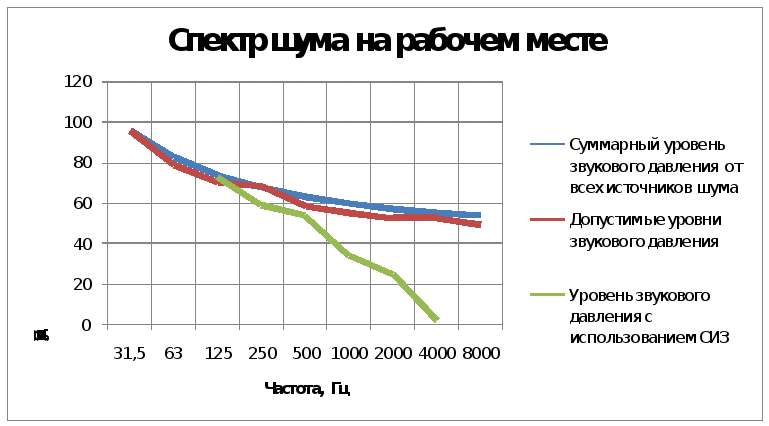 Вкладыши Беруши + ВЦНИИОТ-2 В Уровень замеренный звукового давления превышает допустимый по всему спектру частот. Перечень возможных мероприятий для снижения уровня звукового давления: Акустические – звукоизоляция, звукопоглощение, виброизоляция, глушение шума; Архитектурно-планировочные – рациональная планировка здания, размещение оборудования, создание шумозащищенных зон; Организационно-технические – применение малошумных технологических процессов, оснащение дистанционным управлением, и т.д. В нашем случае были применены СИЗ вкладыши «Беруши» + ВЦНИИОТ-2, в результате чего воздействие шума снижено до допустимого по всему спектру.
