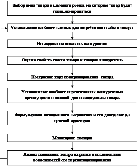 Рисунок 1 –Процесс позиционирования товара Примечание –Источник [5, с.102] При анализе карты позиционирования и с учетом превосходства отдельных конкурентов в удерживаемых ими позициях устанавливаются наиболее перспективные конкурентные преимущества и позиции для предлагаемого товара. После этого формируются и доводятся до целевой аудитории свойства, характеризующие товар и позволяющие завоевать конкурентные преимущества в умах потребителей [5, с. 102]. Проведя такой анализ и оценив возможности конкурентов, предприятия может приступить к планированию комплекса маркетинга, т. е. всего того, что предприятие может предпринять для оказания воздействия на спрос своего товара. Так, если оценка показала, что собственная продукция превосходит по своим характеристикам и показателям качествапродукцию конкурента, то можно позиционировать товар в сегменте как продукцию высокой стоимости, произвести соответствующую расфасовку и упаковку, подобрать торговых посредников, имеющих хорошую репутацию, создать рекламу, лучше стимулировать сбыт и т, д. Для правильного определения стратегии предприятия особое внимание следует уделить вопросу ценообразования. Основными факторами, которые учитываются при принятии решения об уровне цен на экспортируемую продукцию, являются издержки предприятия, реакция потребителей на предлагаемые цены и цены конкурентов. В соответствии с этими факторами предприятие при выходе на зарубежные рынки и его освоении разрабатывает детальный расчет издержек и прибыли с учетом жизненного цикла экспортируемого товара, в основе которого лежат показатели объема продаж, издержек производства и обращения, фазы жизненного цикла товара с увязкой особенностей потенциального рынка сбыта. Анализ условий работы предприятия на выбранных сегментах рынка необходим для принятия эффективных управленческих решений. При этом имеется в виду изучение коммерческой практики, сложившейся на рынке, условий товародвижения, законодательной и налоговой базы, торгово-политических условий и др. Значение изучения существующей коммерческой практики состоит в том, что для эффективной работы необходимы знания торговых обычаев, сложившихся на данном рынке, применяемых условий поставки товаров, методов и способов установления цены, форм и методов расчета, валюты платежа и других условий. Изучение условий движения товара поможет правильно выбрать базисные условия поставки, определиться с видом транспорта на основе анализа тарифов на перевозку различными видами, выбрать наиболее целесообразный способ проникновения на рынок. Такими способами могут быть: поиск заинтересованного партнера и ведение дела только с ним; использование услуг посредников; создание собственной сбытовой сети; организация производства продукции непосредственно на определенном сегменте рынка [11, с. 139]. В условиях жесткой международной конкуренции выход предприятия на внешний рынок должен проводиться по заранее разработанной стратегии, основанной на маркетинговом изучении возможных рынков. Значительных различий в маркетинговом подходе к изучению внутреннего и внешнего рынков нет. Однако необходимо учитывать некоторые особенности. В том и в другом случаях концепция маркетинга основывается на современном состоянии потребительского спроса и прог