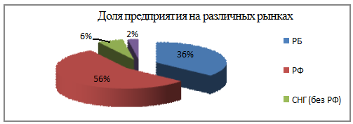 Рисунок 2 –Доля предприятия на различных рынках Примечание –Источник: собственная разработка Общая характеристика рынков сбыта счетчиков газа. Рынок счетчиков газа разделён на 2 части: бытовые (G1–G6) и промышленные счетчики газа. Наше предприятие производит только бытовые счетчики газа. Основные рынки сбыта вышеуказанной продукции – Российская федерация (емкость рынка около 2 млн. счетчиков) и Республика Беларусь (емкость рынка около 90000 шт.). Также в незначительных количествах счетчики экспортируются в Казахстан и Грузию, однако эти рынки являются неперспективными в связи с небольшой численностью населения и более гибкой ценовой политикой конкурентов (Китай, Армения). Доля нашего предприятия на рынке Российской Федерации составляет около 20 %, на рынке Республики Беларусь около 70 %. В 2010 году планируется увеличение объема продаж на 15-20 %, что обусловлено запуском в серийное производство счетчика с термокомпенсатором и дальнейшим наращиванием темпов газификации средних и малых городов в РФ. Общая характеристика рынков сбыта оптико-электронной продукции. В интересах ОАО «БелОМО-ММЗ им. С.И. Вавилова» находятся следующие регионы, деятельность в которых представляется наиболее перспективной в 2010 году: - Республика Беларусь; - Россия; - Украина; - Страны Центральной Азии (ЦА): Армения, Узбекистан, Кыргызстан, Азербайджан, Туркменистан, Таджикистан; - Страны Европейского Союза (ЕС) - Страны Ближнего Востока: Иран. Ирак, Сирия, Ливан, Ливия, Израиль и т.д. - Северная Африка: Египет, Алжир, Марокко, Тунис. - Южная Америка (прежде всего Венесуэла); - Юго-Восточная Азия (ЮВА). Анализ рынка сбыта оптико-электронной продукции. Рынок Республики Беларусь. Малая емкость рынка, слабый платежеспособный спрос, сильная конкуренция. Объем рынка составляет порядка 60 млн. долл. Рост рынка за последние 5 лет составляет в среднем 5-7% в год. Прогнизируемый рост объема рынка в 2010 году на 3-5%. Доля предприятия на рынке в 2009 году составляет около 7%. Рынок Российской Федерации. Большая емкость рынка, большой интерес потребителей к оптико-электронной продукции, наличие платежеспособного спроса, сильная конкуренция. Объем рынка составляет порядка 3500 млн. долл. Рост рынка за последние 5 лет составляет в среднем 7-9% в год. Прогнозируемый рост объема рынка в 2010 году на 5-7%. Доля предприятия на рынке в 2009 году составляет менее 1%. Рынок стран Центральной Азии. Рынок оптико-электронной продукции данного региона имеет маленькую емкость, интерес к оптико-электронной продукции слабый, конкуренция низкая. Объем рынка составляет порядка 60 млн. долл. Рост рынка за последние 5 лет составляет в среднем 5-7% в год. Прогнозируемый рост объема рынка в 2010 году на 1-3%. Доля предприятия на рынке в 2009 году составляет менее 1%. Рынок стран Ближнего Востока. Рынок региона имеет большую емкость и среднюю степень конкуренции. Объем рынка составляет порядка 1200 млн. долл. Рост рынка за последние 5 лет составляет в среднем 3-5% в год. Прогнозируемый рост объема рынка в 2010 году на 2-4%. Доля предприятия на рынке в 2009 году составляет менее 1%. Рынок Северной Африки. Рынок региона имеет сравнительно небольшую емкость (за счет продукции для туристов) и среднюю степень конкуренции. Объем рынка составляет порядка 230 млн. долл. Рост рынка за последние 5 лет составляет в среднем 3-5% в год. Прогнозируемое увеличение емкос